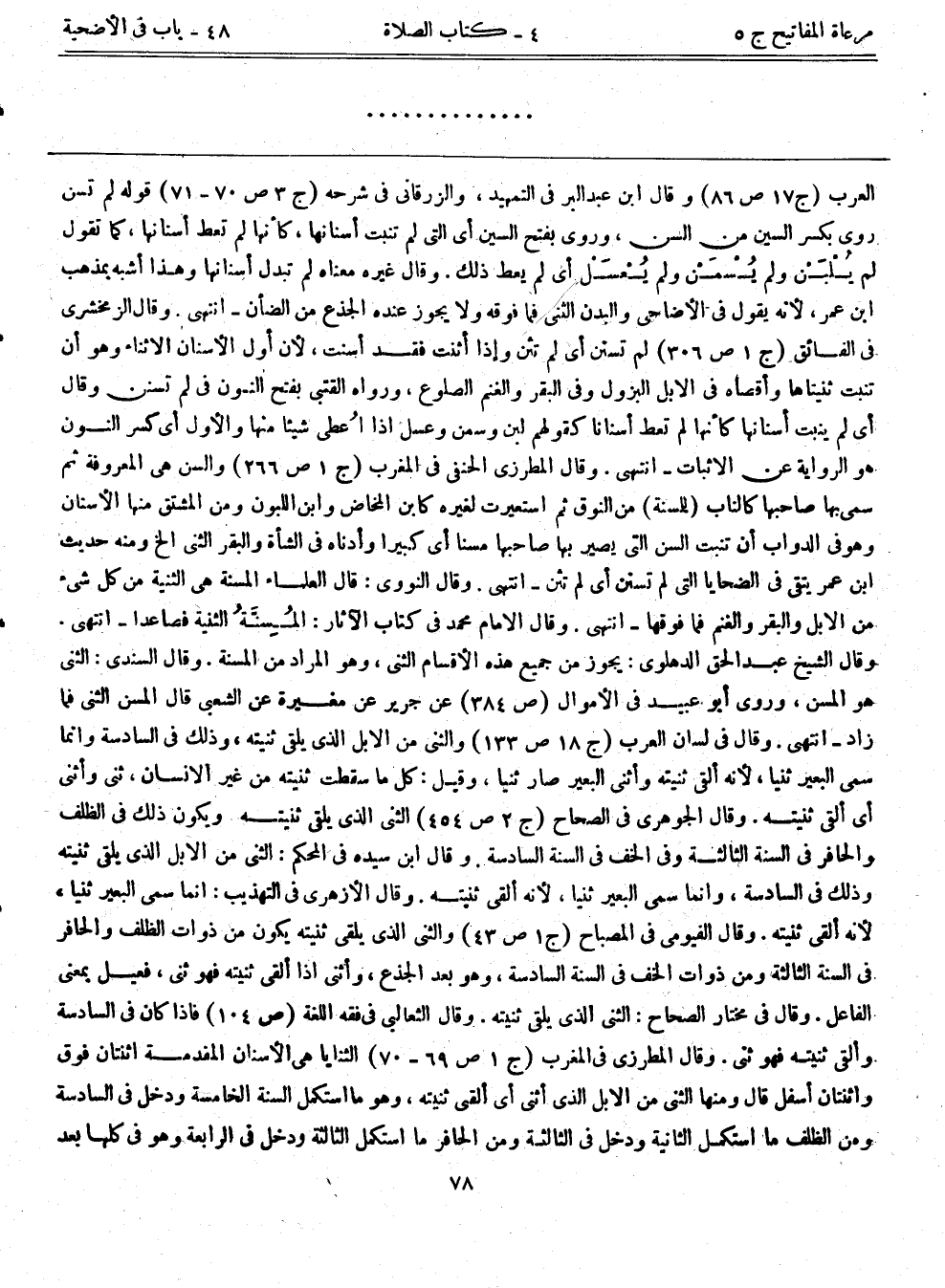 العرب (ج17 ص86) : وقال ابن عبد البر في التمهيد: والزرقاني في شرحه (ج3 ص70-71) قوله: "لم تسن" روي بكسر السين من السن، وروي بفتح السين أي التي لم تنبت أسنانها، كأنها لم تعط أسنانها، كما تقول: لم يُلْبَن ولم يُسْمَن ولم يُعْسَل، أي لم يعط ذلك، وقال غيره: معناه لم تبدل أسنانها، وهذ أشبه بمذهب ابن عمر؛ لأنه يقول في الأضاحي والبدن الثني فما فوقه ولا يجوز عنده الجذع من الضأن – انتهى. وقال الزمخشري في الفائق (ج1 ص306) لم تستن أي لم تثن وإذا أثنت فقد أسنت؛ لأن أول الأسنان الإثناء، وهو أن تنبت ثنيتاها وأقصاه في الإبل البزول، وفي البقر والغنم الصلوع، ورواه القتبي بفتح النون في لم تسن، وقال: أي لم ينبت أسنانها كأنها لم تعط أسناناً كقولهم لبن وسمن وعسل إذا أُعطي شيئاً منها، والأول أي كسر النون هو الرواية عن الأثبات – انتهى. وقال المطرزي الحنفي في المغرب (ج1 ص266) : والسن هي المعروفة ثم سمى بها صاحبها كالناب – للمسنة – من النوق ثم استعيرت لغيره كابن المخاض وابن اللبون، ومن المشتق منها الأسنان وهو في الدواب أن تنبت السن التي يصير بها صاحبها مسناً أي كبيراً وأدناه في الشاة والبقر الثني ... الخ، ومنه حديث ابن عمر: يتقى من الضحايا التي لم تسنن أي لم تثن – انتهى. وقال النووي: قال العلماء: المسنة هي الثنية من كل شيء من الإبل والبقر والغنم فما فوقها – انتهى. وقال الإمام محمد في كتاب الآثار: المُسِنّة الثنية فصاعدا – انتهى. وقال الشيخ عبد الحق الدهلوي: يجوز من جميع هذه الأقسام الثني، وهو المراد من المسنة، وقال السندي: الثني هو المسن، وروى أبوعبيد في الأموال (ص384) عن جرير عن مغيرة عن الشعبي قال: المسن الثني فما زاد – انتهى. وقال في لسان العرب (ج18 ص133) : والثني من الإبل الي يلقي ثنيته، وذلك في السادسة، وإنما سمي البعير ثنياً لأنه ألقى ثنيته وأثنى البعير صار ثنياً، وقيل: كل ما سقطت ثنيته من غير الإنسان، ثنى وأثنى أي ألقى ثنيته، وقال الجوهري في الصحاح (ج2 ص454) الثني الذي يلقي ثنيته، ويكون ذلك في الظلف والحافر في السنة الثالثة وفي الخف في السنة السادسة، وقال ابن سيده في المحكم: الثني من الإبل الذي يلقي ثنيته، وذلك في السادسة، وإنما سمي البعير ثنياً لأنه ألقى ثنيته، وقال الأزهري في التهذيب: إنما سمي البعير ثنياً لأنه ألقى ثنيته، وقال الفيومي في المصباح (ج1 ص43) والثني الذي يلقي ثنيته يكون من ذوات الظلف والحافر في السنة الثالثة، ومن ذوات الخف في السنة السادسة، وهو بعد الجذع، وأثنى إذا ألقى ثنيته فهو ثني، فعيل بمعنى الفاعل، وقال في مختار الصحاح: الثني الذي يلقي ثنيته. وقال الثعالبي في فقه اللغة (ص104) فإذا كان في السادسة وألقى ثنيته فهو ثني. وقال المطرزي في المغرب (ج1 ص69-70) : الثنايا هي الأسنان المقدمة اثنتان فوق واثنتان أسفل قال: ومنها الثني من الإبل الذي أثنى أي ألقى ثنيته، وهو ما استكمل السنة الخامسة ودخل في السادسة ومن الظلف ما استكمل الثانية ودخل في الثالثة ومن الحافر ما استكمل الثالثة ودخل في الرابعة وهو في كلها بعد