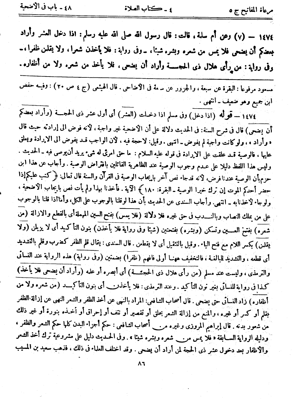 1474- (7) وعن أم سلمة قالت: قال رسول الله - صلى الله عليه وسلم -: ((إذا دخل العشر وأراد بعضكم أن يضحي فلا يمس من شعره وبشره شيئاً – وفي رواية – فلا يأخذن شعراً، ولا يقلمن ظفراً -، وفي رواية: من رأى هلال ذي الحجة وأراد أن يضحي فلا يأخذ من شعره ولا من أظفاره -)) .