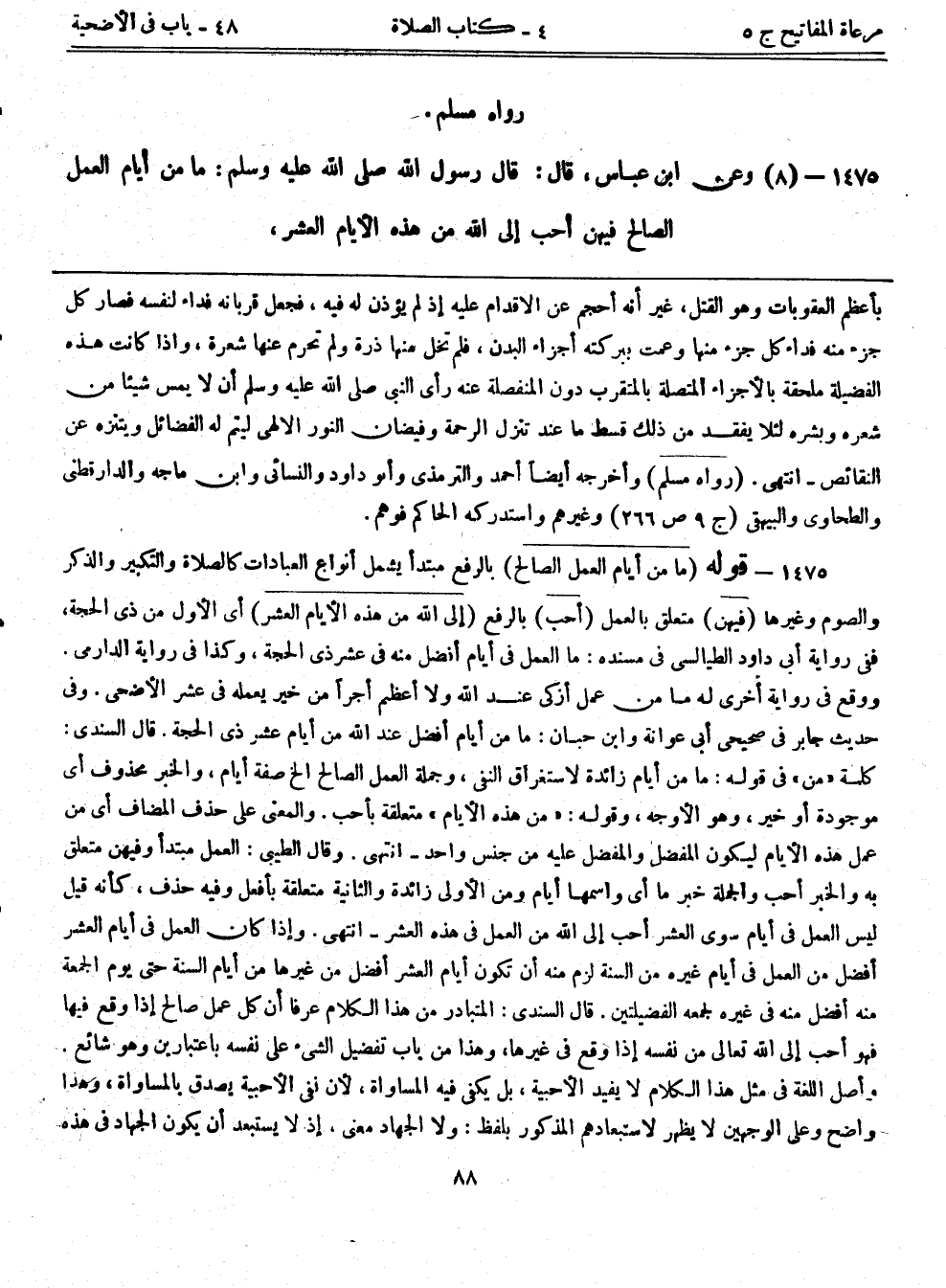 1475- (8) وعن ابن عباس قال: قال رسول الله - صلى الله عليه وسلم -: ((ما من أيام العمل الصالح فيهن أحب إلى الله من هذه الأيام العشر،