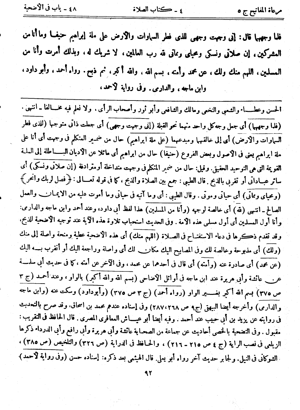 فلما وجههما قال: ((إني وجهت وجهي للذي فطر السماوات والأرض على ملة إبراهيم حنيفاً وما أنا من المشركين، إن صلاتي ونسكي ومحياي ومماتي لله رب العالمين، لا شريك له وبذلك أمرت وأنا من المسلمين، اللهم منك ولك، عن محمد وأمته، بسم الله، والله أكبر)) ، ثم ذبح، رواه أحمد، وأبوداود، وابن ماجه، والدارمي، وفي رواية لأحمد: