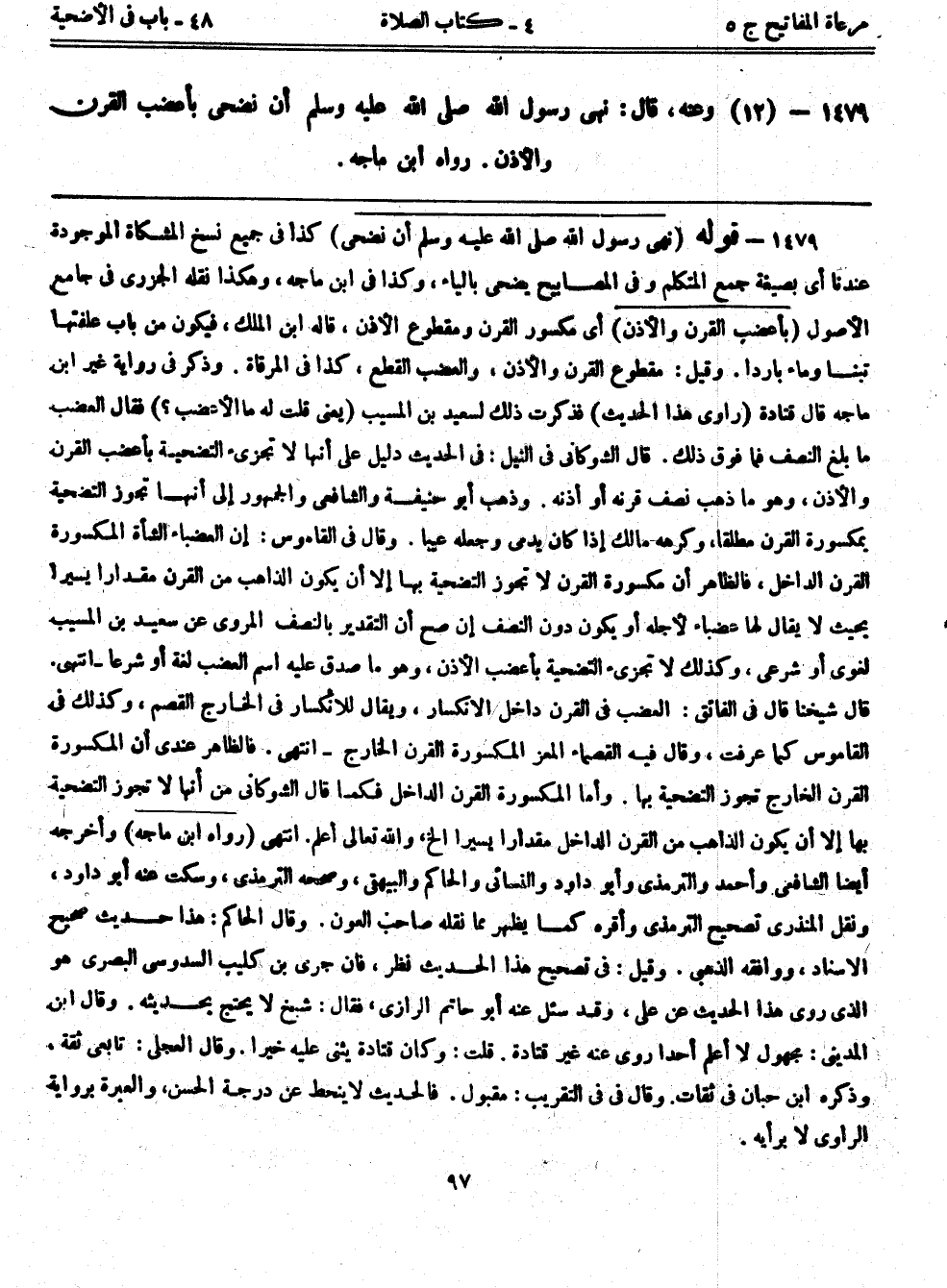 1479- (12) وعنه قال: نهى رسول الله - صلى الله عليه وسلم - أن نضحي بأعضب القرن والأذن. رواه ابن ماجه.