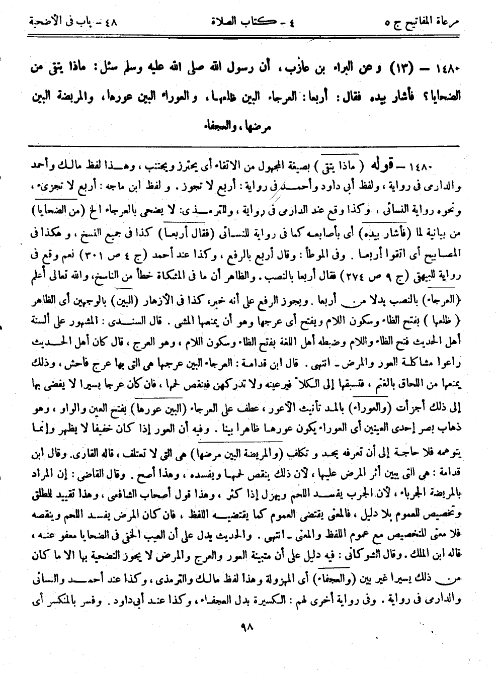 1480- قوله (ماذا يتقى) بصيغة المجهول من الاتقاء أي يحترز ويجتنب، وهذا لفظ مالك وأحمد والدارمي في رواية، ولفظ أبي داود وأحمد في رواية: ((أربع لا تجوز)) ، ولفظ ابن ماجه: ((أربع لا تجزئ)) ، ونحوه رواية النسائي، وكذا وقع عند الدارمي في رواية، وللترمذي: ((لا يضحى بالعرجاء ... )) الخ. (من الضحايا) من بيانية لما (فأشار بيده) أي بأصابعه كما في رواية للنسائي (فقال: أربعاً) كذا في جميع النسخ، وهكذا في المصابيح، أي اتقوا أربعاً، وفي الموطأ: وقال: ((أربع)) بالرفع، وكذا عند أحمد (ج4 ص301) نعم وقع في رواية للبيهقي (ج9 ص274) فقال: ((أربعاً)) بالنصب، والظاهر أن ما في المشكاة خطأ من الناسخ، والله تعالى أعلم. (العرجاء) بالنصب بدلاً من أربعاً، ويجوز الرفع على أنه خبر، كذا في الأزهار (البين) بالوجهين أي الظاهر (ظلعها) بفتح الظاء وسكون اللام وبفتح، أي عرجها، وهو أن يمنعها المشي، قال السندي: المشهور على ألسنة أهل الحديث فتح الظاء واللام، وضبطه أهل اللغة بفتح الظاء وسكون اللام، هو العرج، قال: كأن أهل الحديث راعوا مشاكلة العور والمرض – انتهى. قال ابن قدامة: العرجاء البين عرجها هي التي بها عرج فاحش، وذلك يمنعها من اللحاق بالغنم، فتسبقها إلى الكلأ فيرعينه ولا تدركهن فينقص لحمها، فإن كان عرجاً يسيراً لا يفضي بها إلى ذلك أجزأت (والعوراء) بالمد تأنيث الأعور، عطف على العرجاء (البين عورها) بفتح العين والواو، وهو ذهاب بصر إحدى العينين، أي العوراء يكون عورها ظاهراً بيناً، وفيه أن العور إذا كان خفيفاً لا يظهر وإنما يتوهمه فلا حاجة إلى أن تعرفه بجد وتكلف (والمريضة البين مرضها) هي التي لا تعتلف، قاله القاري، وقال ابن قدامة: هي التي يبين أثر المرض عليها؛ لأن ذلك ينقص لحمها ويفسده، وهذا أصح. وقال القاضي: إن المراد بالمريضة الجرباء؛ لأن الجرب يفسد اللحم ويهزل إذا كثر، وهذا قول أصحاب الشافعي، وهذا تقييد للمطلق وتخصيص للعموم بلا دليل، فالمعنى يقتضي العموم كما يقتضيه اللفظ، فإن كان المرض يفسد اللحم وينقصه فلا معنى للتخصيص مع عموم اللفظ والمعنى – انتهى. والحديث يدل على أن العيب الخفي في الضحايا معفو عنه، قاله ابن الملك، وقال الشوكاني: فيه دليل على أن متبينة العور والعرج والمرض لا يجوز التضحية بها إلا ما كان من ذلك يسيراً غير بين (والعجفاء) أي المهزولة، وهذا لفظ مالك والترمذي، وكذا عند أحمد والنسائي والدارمي في رواية، وفي رواية أخرى لهم: الكسيرة بدل العجفاء، وكذا عند أبي داود، وفسر بالمنكسر أي
