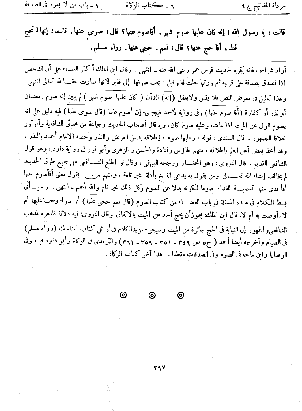 أراد شراءه، فإنه يكره لحديث فرس عمر رضي الله عنه - انتهى. وقال ابن الملك أكثر العلماء على أن الشخص إذا تصدق بصدقة على قريبة ثم ورثها حلت له وقيل: يجب صرفها إلى فقير؛ لأنها صارت حقاً لله تعالى انتهى وتعليل في معرض النص فلا يقبل ولا يعقل (إنه) الشأن (كان عليها صوم شهر) لم يبين إنه صوم رمضان أو نذر أو كفارة (أفاصوم عنها) وفي رواية لأحمد فيجزئ إن أصوم عنها (قال صومي عنها) فيه دليل على أنه يصوم الولي عن الميت إذا مات، وعليه صوم كان، وبه قال أصحاب الحديث وجماعة من محدثي الشافعية وأبوثور خلافاً للجمهور. قال السندي: قوله "وعليها صوم" إطلاقه يشمل الفرض والنذر وخصه الإمام أحمد بالنذر، وقد أخذ بعض أهل العلم بإطلاقه، منهم طاووس وقتادة والحسن والزهري وأبوثور في رواية داود، وهو قول الشافعي القديم. قال النووي: وهو المختار ورجحه البيهقي، وقال لو أطلع الشافعي على جميع الطرق الحديث لم يخالف إنشاء الله تعالى ومن يقول به يدعي النسخ بأدلة غير تامة، ومنهم من يقول معنى أفأصوم عنها أم أفدي عنها تسمية الفداء صوماً لكونه بدلاً عن الصوم وكل ذلك غير تام والله أعلم - انتهى. وسيأتي بسط الكلام في هذه المسألة في باب القضاء من كتاب الصوم (قال نعم حجي عنها) أي سواء وجب عليها أم لا، أوصت به أم لا، قال ابن الملك: يجوز أن يحج أحد عن الميت بالاتفاق. وقال النووي: فيه دلالة ظاهرة لمذهب الشافعي والجمهور إن النيابة في الحج جائزة عن الميت وسيجيء مزيد الكلام في أوائل كتاب المناسك (رواه مسلم) في الصيام وأخرجه أيضاً أحمد (ج5 ص349- 351- 359- 361) والترمذي في الزكاة وأبوداود فيه وفي الوصايا وابن ماجه في الصوم وفي الصدقات مقطعاً. هذا آخر كتاب الزكاة.