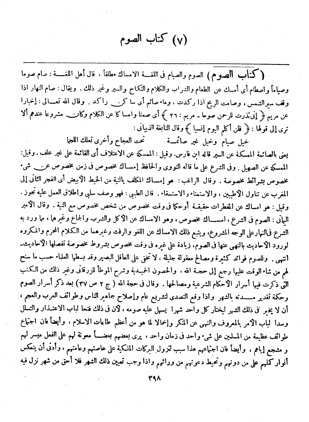 (كتاب الصوم) الصوم والصيام في اللغة: الإمساك مطلقاً، قال أهل اللغة: صام صوم وصياماً واصطام أي أمسك عن الطعام والشراب والكلام والنكاح والسير وغير ذلك. ويقال: صام النهار إذا وقف سير الشمس، وصامت الريح إذا ركدت، وماء صائم أي ساكن راكد. وقال الله تعالى: إخبار عن مريم: {إني نذرت للرحمن صوماً} [مريم:26] أي صمتاً وإمساكاً عن الكلام وكان مشروعاً عندهم ألا ترى إلى قولها: {فلن أكلم اليوم إنسيا} وقال النابغة الذبياني: