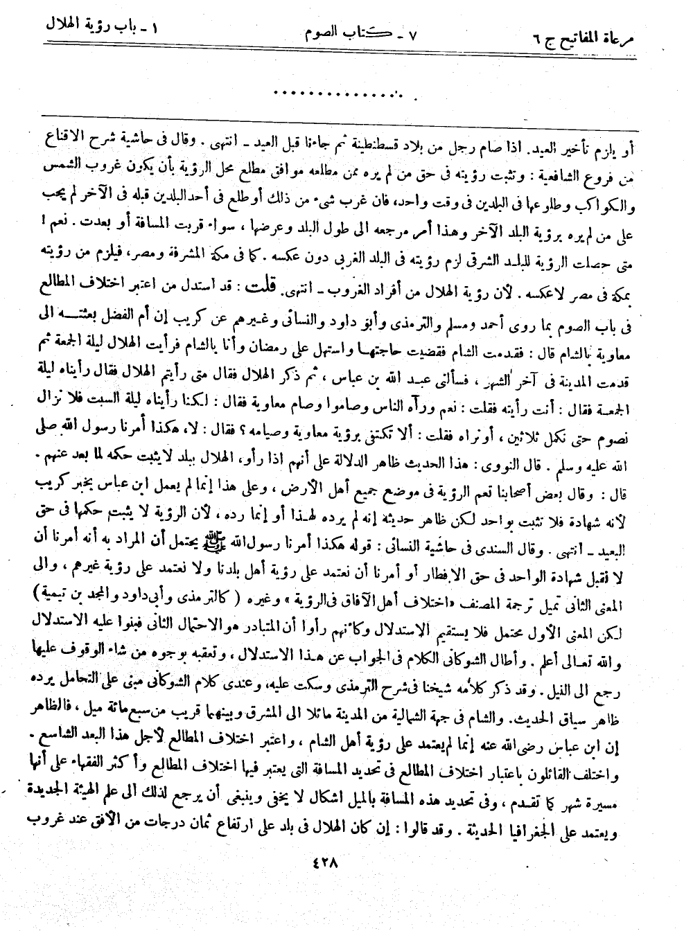 أو يلزم تأخير العيد. إذا صام رجل من بلاد قسطنطينية ثم جاءنا قبل العيد- انتهى. وقال في حاشية شرح الإقناع من فروع الشافعية: وتثبت رؤيته في حق من لم يره ممن مطلعه موافق مطلع محل الرؤية بأن يكون غروب الشمس والكواكب وطلوعها في البلدين في وقت واحد، فإن غرب شيء من ذلك أو طلع في أحد البلدين قبله في الآخر لم يجب على من لم يره برؤية البلد الآخر وهذا أمر مرجعه إلى طول البلد وعرضها، سواء قربت المسافة أو بعدت. نعم! متى حصلت الرؤية للبلد الشرقي لزم رؤيته في البلد الغربي دون عكسه. كما في مكة المشرفة ومصر، فيلزم من رؤيته بمكة في مصر لا عكسه. لأن رؤية الهلال من أفراد الغروب - انتهى. قلت: قد استدل من اعتبر اختلاف المطالع في باب الصوم بما روى أحمد ومسلم والترمذي وأبوداود والنسائي وغيرهم عن كريب إن أم الفضل بعثته إلى معاوية بالشام قال: فقدمت الشام فقضيت حاجتها واستهل على رمضان وأنا بالشام فرأيت الهلال ليلة الجعة ثم قدمت المدينة في آخر الشهر، فسألني عبد الله بن عباس، ثم ذكر الهلال فقال متى رأيتم الهلال فقال رأيناه ليلة الجمعة فقال: أنت رأيته فقلت: نعم ورآه الناس وصاموا وصام معاوية فقال: لكنا رأيناه ليلة السبت فلا نزال نصوم حتى نكمل ثلاثين، أو نراه فقلت: ألا تكتفي برؤية معاوية وصيامه؟ فقال: لا، هكذا أمرنا رسول الله - صلى الله عليه وسلم -. قال النووي: هذا الحديث ظاهر الدلالة على أنهم إذا رأوا، الهلال ببلد لا يثبت حكمه لما بعد عنهم. قال: وقال بعض أصحابنا تعم الرؤية في موضع جميع أهل الأرض، وعلى هذا إنما لم يعمل ابن عباس بخبر كريب لأنه شهادة فلا تثبت بواحد لكن ظاهر حديثه إنه لم يرده لهذا أو إنما رده، لأن الرؤية لا يثبت حكمها في حق البعيد - انتهى. وقال السندي في حاشية النسائي: قوله هكذا أمرنا رسول الله - صلى الله عليه وسلم - يحتمل أن المراد به أنه أمرنا أن لا نقبل شهادة الواحد في حق الإفطار أو أمرنا أن نعتمد على رؤية أهل بلدنا ولا نعتمد على رؤية غيرهم، وإلى المعنى الثاني تميل ترجمة المصنف "اختلاف أهل الآفاق في الرؤية" وغيره (كالترمذي وأبي داود والمجد بن تيمية) لكن المعنى الأول محتمل فلا يستقيم الاستدلال وكأنهم رأوا أن المتبادر هو الاحتمال الثاني فبنوا عليه الاستدلال والله تعالى أعلم. وأطال الشوكاني الكلام في الجواب عن هذا الاستدلال، وتعقبه بوجوه من شاء الوقوف عليها رجع إلى النيل، وقد ذكر كلامه شيخنا في شرح الترمذي وسكت عليه، وعندي كلام الشوكاني مبني على التحامل يرده ظاهر سياق الحديث. والشام في جهة الشمالية من المدينة مائلاً إلى المشرق وبينهما قريب من سبعمائة ميل، فالظاهر إن ابن عباس رضي الله عنه إنما لم يعتمد على رؤية أهل الشام، واعتبر اختلاف المطالع لأجل هذا البعد الشاسع. واختلف القائلون باعتبار اختلاف المطالع في تحديد المسافة التي يعتبر فيها اختلاف المطالع وأكثر الفقهاء على أنها مسيرة شهر كما تقدم، وفي تحديد هذه المسافة بالميل إشكال لا يخفى وينبغي أن يرجع لذلك إلى علم الهيئة الجديدة ويعتمد على الجغرافيا الحديثة. وقد قالوا: إن كان الهلال في بلد على ارتفاع ثمان درجات من الأفق عند الغروب
