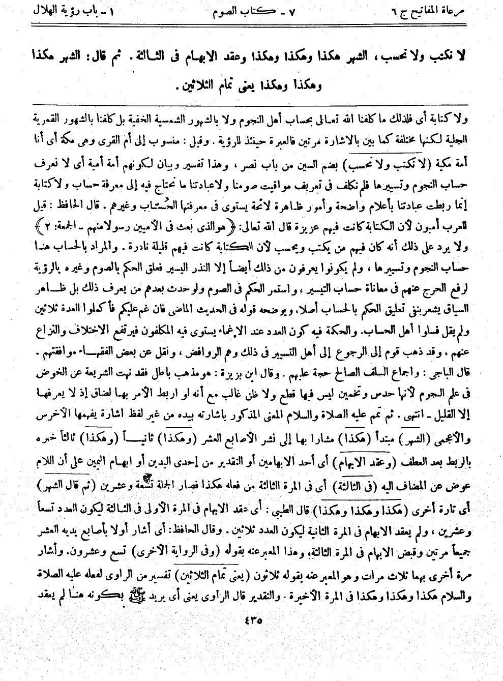 ولا كتابة أي فلذلك ما كلفنا الله تعالى بحساب أهل النجوم ولا بالشهور الشمسية الخفية بل كلفنا بالشهور القمرية الجلية لكنها مختلفة كما بين بالإشارة مرتين فالعبرة حينئذٍ للرؤية. وقيل: منسوب إلى أم القرى وهي مكة أي أنا أمة مكية (لا نكتب ولا نحسب) بضم السين من باب نصر، وهذا تفسير وبيان لكونهم أمة أمية أي لا نعرف حساب النجوم وتسييرها فلم نكلف في تعريف مواقيت صومنا ولا عبادتنا ما نحتاج فيه إلى معرفة حساب ولا كتابة إنما ربطت عبادتنا بأعلام واضحة وأمور ظاهرة لائحة يستوي في معرفة الحُسّاب وغيرهم. قال الحافظ: قيل للعرب أميون لأن الكتابة كانت فيهم عزيزة قال الله تعالى: {هو الذي بعث في الأميين رسولاً منهم} [الجمعة:2] ولا يرد على ذلك أنه كان فيهم من يكتب ويحسب لأن الكتابة كانت فيهم قليلة نادرة. والمراد بالحساب هنا حساب النجوم وتسييرها، ولم يكونوا يعرفون من ذلك أيضاً إلا النذر اليسير فعلق الحكم بالصوم وغيره بالرؤية لرفع الحرج عنهم في معاناة حساب التيسير، واستمر الحكم في الصوم ولو حدث بعدهم من يعرف ذلك بل ظاهر السياق يشعر بنفي تعليق الحكم بالحساب أصلاً، ويوضحه قوله في الحديث الماضي فإن غم عليكم فأكملوا العدة ثلاثين ولم يقل فسلوا أهل الحساب. والحكمة فيه كون العدد عند الإغماء يستوي فيه المكلفون فيرتفع الاختلاف والنزاع عنهم، وقد ذهب قوم إلى الرجوع إلى أهل التسيير في ذلك وهم الروافض، ونقل عن بعض الفقهاء موافقتهم. قال الباجي: وإجماع السلف الصالح حجة عليهم. وقال ابن بزيزة: هو مذهب باطل فقد نهت الشريعة عن الخوض في علم النجوم لأنها حدس وتخمين ليس فيها قطع ولا ظن غالب مع أنه لو أربط الأمر بها لضاق إذ لا يعرفها إلا القليل - انتهى. ثم تمم عليه الصلاة والسلام المعنى المذكور بإشارته بيده من غير لفظ إشارة يفهمها الأخرس والأعجمي (الشهر) مبتدأ (هكذا) مشار بها إلى نشر الأصابع العشر (وهكذا) ثانياً (وهكذا) ثالثاً خبره بالربط بعد العطف (وعقد الإبهام) أي أحد الإبهامين أو التقدير من إحدى اليدين أو إبهام اليمين على أن اللام عوض عن المضاف إليه (في الثالثة) أي في المرة الثالثة من فعله هكذا فصار الجملة تسعة وعشرين (ثم قال الشهر) أي تارة أخرى (هكذا وهكذا وهكذا) قال الطيبي: أي عقد الإبهام في المرة الأولى في الثالثة ليكون العدد تسعاً وعشرين، ولم يعقد الإبهام في المرة الثانية ليكون العدد ثلاثين. وقال الحافظ: أي أشار أولاً بأصابع يديه العشر جميعاً مرتين وقبض الإبهام في المرة الثالثة، وهذا المعبر عنه بقوله (وفي الرواية الأخرى) تسع وعشرون. وأشار مرة أخرى بهما ثلاث مرات وهو المعبر عنه بقوله ثلاثون (يعني تمام الثلاثين) تفسير من الراوي لفعله عليه الصلاة والسلام هكذا وهكذا وهكذا في المرة الأخيرة. والتقدير قال الراوي يعني أي يريد - صلى الله عليه وسلم - بكونه هنا لم يعقد