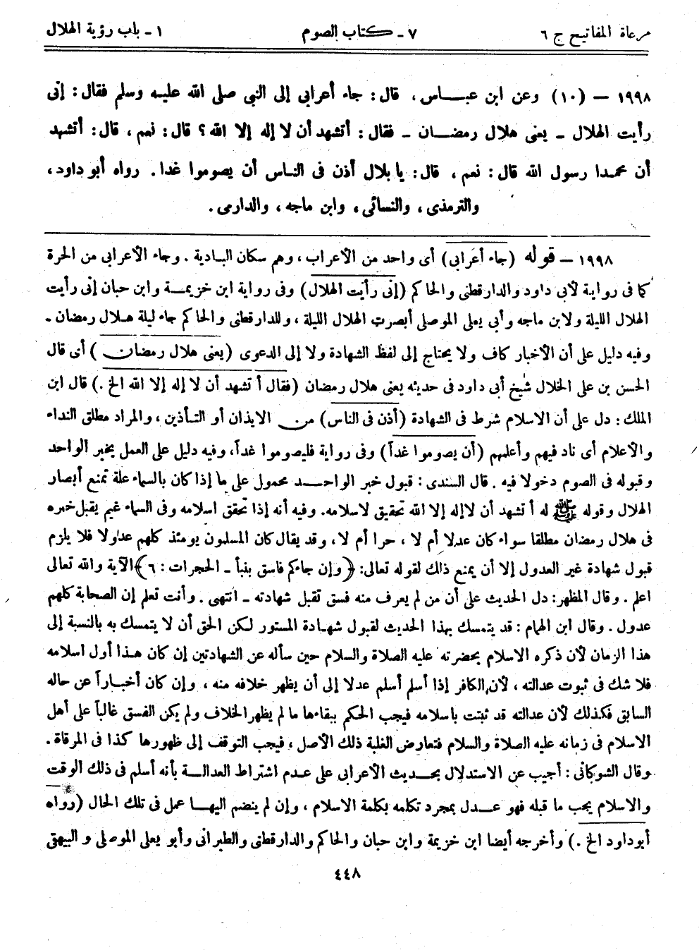 1998- (10) وعن ابن عباس، قال: جاء أعرابي إلى النبي - صلى الله عليه وسلم - فقال: إني رأيت الهلال- يعني هلال رمضان - فقال: ((أتشهد أن لا إله إلا الله؟ قال: نعم، قال: أتشهد أن محمداً رسول الله قال: نعم، قال: يا بلال أذن في الناس أن يصوموا غداً)) . رواه أبوداود، والترمذي، والنسائي، وابن ماجه والدارمي.