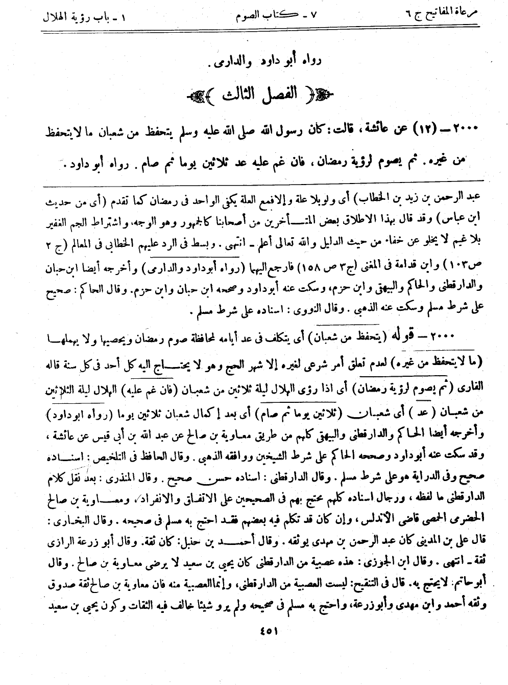 2000- (12) عن عائشة، قالت: ((كان رسول الله - صلى الله عليه وسلم - يتحفظ من شعبان مالا يتحفظ من غيره. ثم يصوم لرؤية رمضان، فإن غم عليه عد ثلاثين يوماً ثم صام)) . رواه أبوداود.