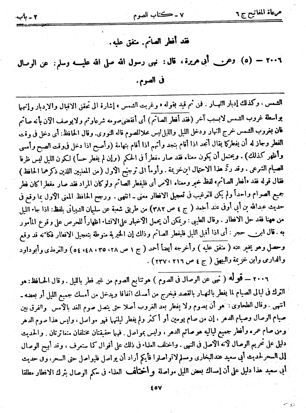 2006 - (5) وعن أبي هريرة، قال: نهى رسول الله صلى الله عليه وسلم: ((عن الوصال في الصوم.