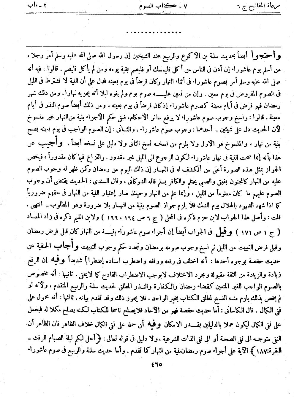 واحتجوا أيضاً بحديث سلمة بن الأكوع والربيع عند الشيخين إن رسول الله - صلى الله عليه وسلم - أمر رجلاً، من أسلم يوم عاشوراء إن أذن في الناس من أكل فليمسك أو فليصم بقية يومه ومن لم يأكل فليصم. قالوا: فيه أنه - صلى الله عليه وسلم - أمر بصوم عاشوراء في أثناء النهار وكان فرضاً في يوم بعينه فدل على أن النية لا تشترط في الليل في الصوم المفروض في يوم معين، وإن من تعين عليه صوم يوم ولم ينوه ليلاً أنه يجزيه نهاراً. ومن ذلك شهر رمضان فهو فرض في أيام معينة كصوم عاشوراء إذ كان فرضاً في يوم بعينه، ومن ذلك أيضاً صوم النذر في أيام معينة. قالوا: ونسخ وجوب صوم عاشوراء لا يرفع سائر الأحكام، فبقي حكم الأجزاء بنية من النهار غير منسوخ لأن الحديث دل على شيئين. أحدهما: وجوب صوم عاشوراء. والثاني: إن الصوم الواجب في يوم بعينه يصح بنية من نهار، والمنسوخ هو الأول ولا يلزم من نسخه نسخ الثاني ولا دليل على نسخه أيضاً. وأجيب عن هذا بأنه إنما صحت النية في نهار عاشوراء لكون الرجوع إلى الليل غير مقدور. والنزاع فيما كان مقدوراً، فيخص الجواز بمثل هذه الصورة أعنى من أنكشف له في النهار إن ذلك اليوم من رمضان وكمن ظهر له وجوب الصوم عليه من النهار كالمجنون يفيق والصبي يحتلم والكافر يسلم قاله الشوكاني، وقال السندي: الحديث يقتضي أن وجوب الصوم عليهم ما كان معلوماً من الليل، وإنما علم من النهار وحينئذٍ صار إعتبار النية من النهار في حقهم ضرورياً كما إذا شهد الشهود بالهلال يوم الشك فلا يلزم جواز الصوم بنية من النهار بلا ضرورة وهو المطلوب - انتهى. قلت: وأصل هذا الجواب لابن حزم ذكره في المحلى (ج6 ص164، 166) ولابن القيم ذكره في زاد المعاد (ج1 ص171) وقيل في الجواب أيضاً إن أجزاء صوم عاشوراء بنية من النهار كان قبل فرض رمضان وقبل فرض التبييت من الليل ثم نسخ وجوب صومه برمضان وتجدد حكم وجوب التبييت وأجاب الحنفية عن حديث حفصة بوجوه أحدها: أنه اختلف في رفعه ووقفه واضطراب إسناده إضطراباً شديداً وفيه إن الرفع زيادة والزيادة من الثقة مقبولة ومجرد الاختلاف لا يوجب الاضطراب القادح كما لا يخفي. ثانيها: أنه مخصوص بالصوم الواجب الغير المتعين كقضاء رمضان والكفارة والنذر المطلق لحديث سلمة والربيع المتقدم، ولأنه لو لم يخص بذلك يلزم منه النسخ لمطلق الكتاب بخبر الواحد، فلا يجوز ذلك وقد تقدم بيانه. ثالثها: أنه محمول على نفي الكمال. قال الكاساني: أما حديث حفصة فهو من الآحاد فلا يصلح ناسخاً للكتاب لكنه يصلح مكملاً له فيحمل على نفي الكمال ليكون عملاً بالدليلين بقدر الإمكان وفيه أن حمله على نفي الكمال خلاف الظاهر فإن الظاهر أن النفي متوجه إلى نفي الصحة أو إلى نفي الذات الشرعية، ولا دليل في قوله تعالى: {أحل لكم ليلة الصيام الرفث} [البقرة:187] الآية، على أجزاء صوم رمضان بنية من النهار كما تقدم. وأما حديث سلمة والربيع في صوم عاشوراء