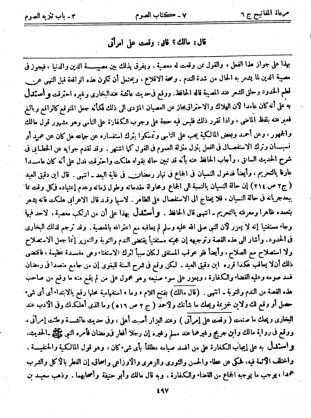 قال: مالك؟ قال: وقعت علي امرأتي