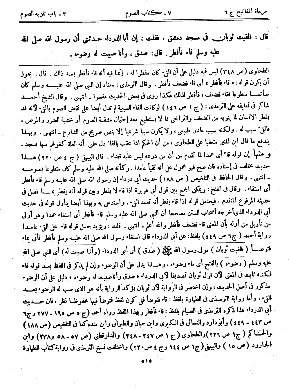 قال: ((فلقيت ثوبان في مسجد دمشق، فقلت: إن أباالدرداء حدثني أن رسول الله - صلى الله عليه وسلم - قاء فأفطر. قال: صدق، وأنا صببت له وضوءه)) .