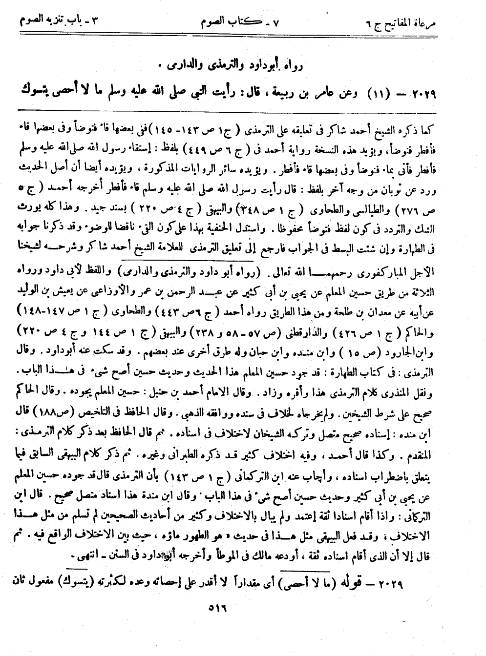 2029- (11) وعن عامر بن ربيعة، قال: ((رأيت النبي - صلى الله عليه وسلم - ما لا أحصى يتسوك