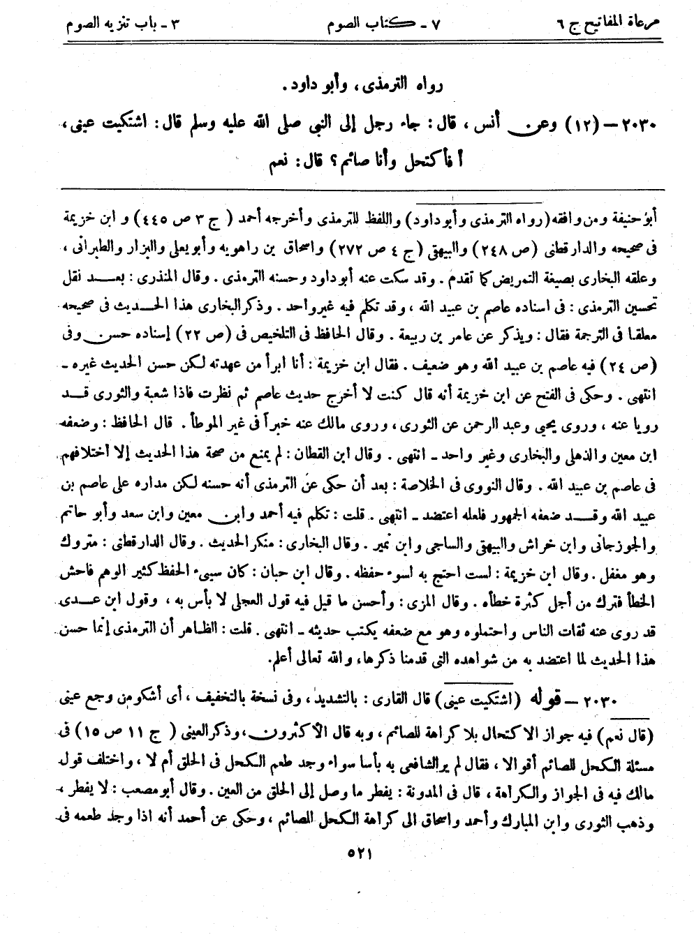 2030- قوله: (اشتكيت عيني) قال القاري: بالتشديد، وفي نسخة بالتخفيف، أي أشكو من وجع عيني (قال نعم) فيه جواز الإكتحال بلا كراهة للصائم، وبه قال الأكثرون، وذكر العيني (ج11:ص15) في مسألة الكحل للصائم أقوالاً، فقال لم ير الشافعي به بأساً وجد طعم الكحل في الحلق أم لا، واختلف قول مالك فيه في الجواز والكراهة، قال في المدونة: يفطر ما وصل إلى الحلق من العين. وقال أبومصعب: لا يفطر، وذهب الثوري وابن المبارك وأحمد وإسحاق إلى كراهة الكحل للصائم، وحكى عن أحمد أنه إذا وجد طعمه في