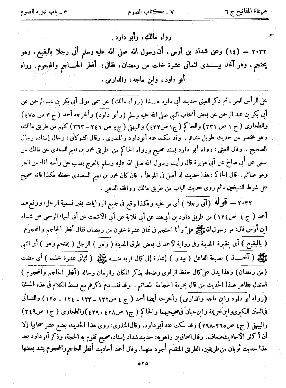 2032- (14) وعن شداد بن أوس، ((أن رسول الله صلى الله عليه وسلم أتى رجلاً بالبقيع، وهو يحتجم، وهو آخذ بيدي لثماني عشرة خلت من رمضان، فقال: أفطر الحاجم والمحجوم)) . رواه أبوداود، وابن ماجه، والدارمي.