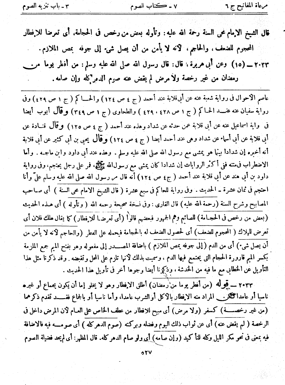 2033- قوله: (من أفطر يوماً من رمضان) أطلق الإفطار وهو لا يخلو إما أن يكون بجماع أو غيره ناسياً أو عامداً لكن المراد منه الإفطار بالأكل أو الشرب عامداً، وأما ناسياً أو بالجماع فقد تقدم ذكرهما (من غير رخصة) كسفر (ولا مرض) أي مبيح للإفطار من عطف الخاص على العام لأن المرض داخل في الرخصة (لم يقض عنه) أي عن ثواب ذلك اليوم وفضله وبركته (صوم الدهر كله) أي صومه فيه فالإضافة فيه بمعنى في نحو مكر الليل وكله للتأكيد (وإن صامه) أي ولو صام الدهر كله. قال المظهر: أي لم يجد فضيلة الصوم