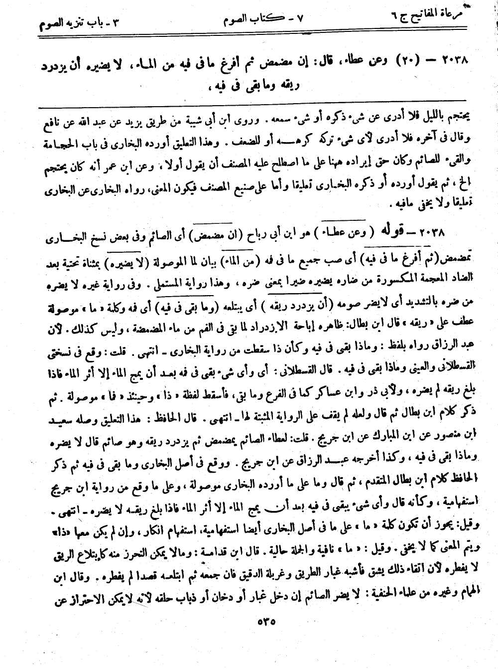 2038- قوله: (وعن عطاء) هو ابن أبي رباح (إن مضمض) أي الصائم وفي بعض نسخ البخاري تمضمض (ثم أفرغ ما في فيه) أي صب جميع ما في فمه (من الماء) بيان لما الموصولة (لا يضيره) بمثناة تحتية بعد الضاد المعجمة المكسورة من ضاره يضيره ضيراً بمعنى ضره، وهذا رواية المستملي. وفي رواية غيره لا يضره من ضره بالتشديد أي لا يضر صومه (أن يزدرد ريقه) أي يبتلعه (وما بقي في فيه) أي فمه وكلمة "ما" موصولة عطف على "ريقه" قال ابن بطال: ظاهره إباحة إلإزدراد لما بقي في الفم من ماء المضمضة، وليس كذلك. لأن عبد الرزاق رواه بلفظ: وماذا بقي في فيه وكأن ذا سقطت من رواية البخاري - انتهى. قلت: وقع في نسختي القسطلاني والعيني وماذا بقي في فيه. قال القسطلاني: أي وأي شيء بقي في فمه بعد أن يمج الماء إلا أثر الماء فإذا بلغ ريقه لم يضره، ولأبي ذر وابن عساكر كما في الفرع وما بقي، فأسقط لفظة "ذا" وحينئذٍ "فما" موصولة. ثم ذكر كلام ابن بطال ثم قال ولعله لم يقف على الرواية المثبتة لها - انتهى. قال الحافظ: هذا التعليق وصله سعيد ابن منصور عن ابن المبارك عن ابن جريج. قلت: لعطاء الصائم يمضمض ثم يزدرد ريقه وهو صائم قال لا يضره وماذا بقي في فيه، وكذا أخرجه عبد الرزاق عن ابن جريج. ووقع في أصل البخاري وما بقي في فيه ثم ذكر الحافظ كلام ابن بطال المتقدم، ثم قال وما على ما أورده البخاري موصولة، وعلى ما وقع من رواية ابن جريج استفهامية، وكأنه قال وأي شيء يبقى في فيه بعد أن يمج الماء إلا أثر الماء فإذا بلغ ريقه لا يضره - انتهى. وقيل: يجوز أن تكون كلمة "ما" على ما في أصل البخاري أيضاً استفهامية، استفهام إنكار، وإن لم يكن معها "ذا" ويتم المعنى كما لا يخفى. وقيل: "ما" نافية والجملة حالية. قال ابن قدامة: ومالا يمكن التحرز منه كابتلاع الريق لا يفطره لأن اتقاء ذلك يشق فأشبه غبار الطريق وغربلة الدقيق فإن جمعه ثم ابتلعه قصداً لم يفطره. وقال ابن الهمام وغيره من علماء الحنفية: لا يضر الصائم إن دخل غبار أو دخان أو ذباب حلقه لأنه لا يمكن الاحتراز عن
