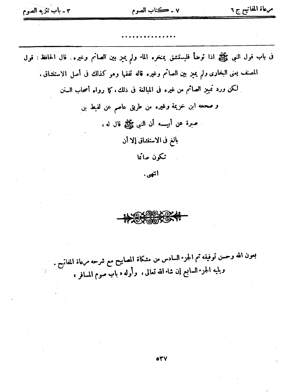 بعون الله وحسن توفيقه تم الجزء السادس من مشكاة المصابيح مع شرحه مرعاة المفاتيح. ويليه الجزء السابع إنشاء الله تعالى، وأوله "باب صوم المسافر".