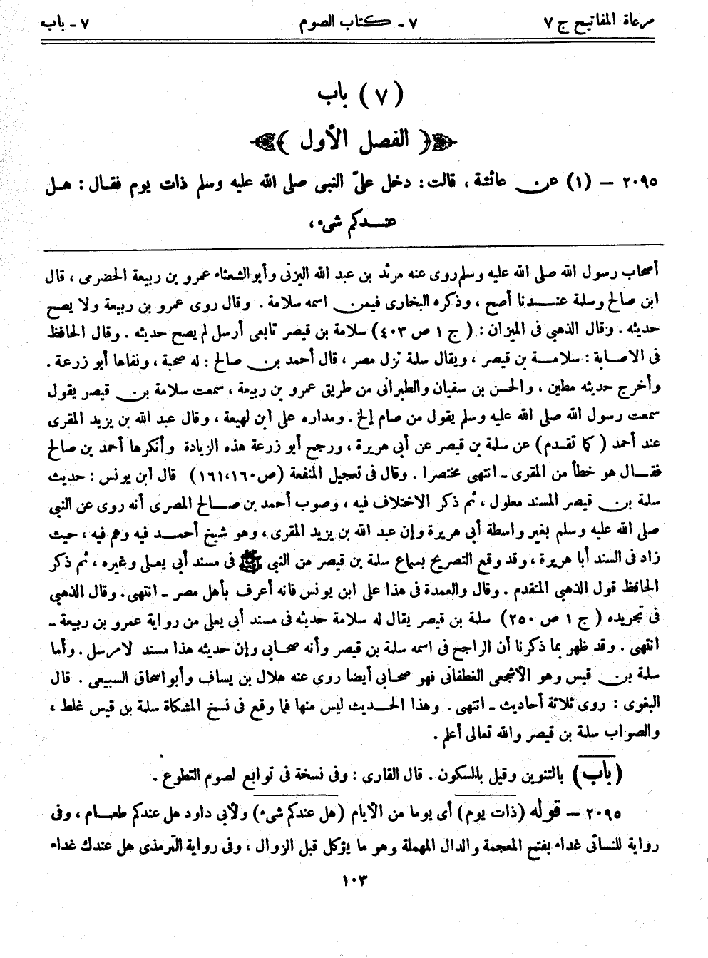 2095- قوله: (ذات يوم) أي يوماً من الأيام (هل عندكم شيء) ولأبي داود هل عندكم طعام، وفي رواية للنسائي غداء بفتح المعجمة والدال المهملة وهو ما يؤكل قبل الزوال، وفي رواية الترمذي هل عندك غداء (فإني إذاً) بالتنوين (صائم) وفي رواية للنسائي إذاً أصوم، وفيه دليل على جواز نية النفل في النهار، وبه قال الأكثرون،