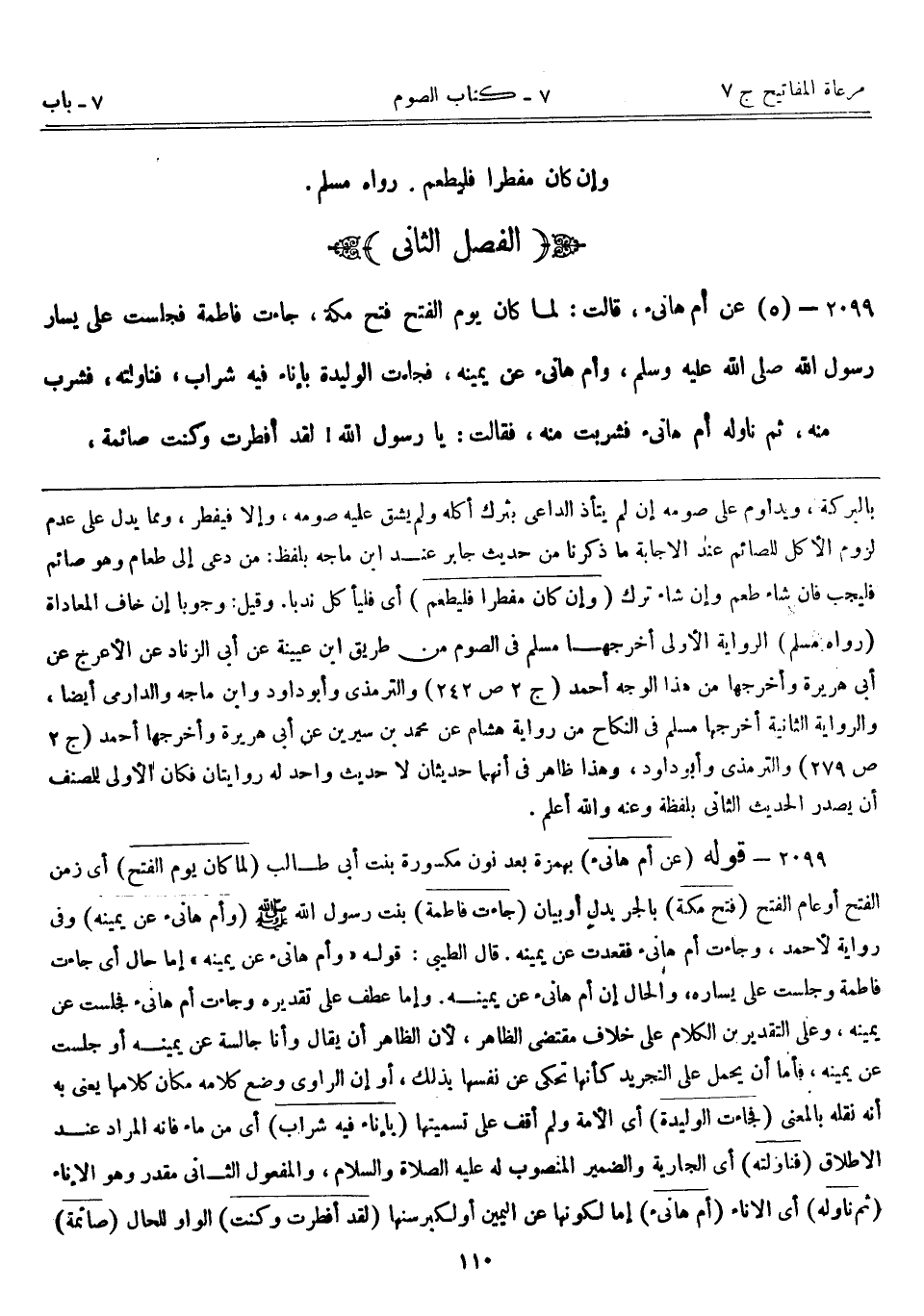 2099- قوله: (عن أم هانىء) بهمزة بعد نون مكسورة بنت أبي طالب (لما كان يوم الفتح) أي زمن الفتح أو عام الفتح (فتح مكة) بالجر بدل أو بيان (جاءت فاطمة) بنت رسول الله - صلى الله عليه وسلم - (وأم هانىء عن يمينه) وفي رواية لأحمد، وجاءت أم هانىء فقعدت عن يمينه. قال الطيبي: قوله "وأم هانىء عن يمينه" إما حال أي جاءت فاطمة وجلست على يساره، والحال إن أم هانىء عن يمينه. وإما عطف على تقديره وجاءت أم هانىء فجلست عن يمينه، وعلى التقديرين الكلام على خلاف مقتضى الظاهر، لأن الظاهر أن يقال وأنا جالسة عن يمينه أو جلست عن يمينه، فأما أن يحمل على التجريد كأنها تحكي عن نفسها بذلك، أو إن الراوي وضع كلامه مكان كلامها يعني به أنه نقله بالمعنى (فجاءت الوليدة) أي الأمة ولم أقف على تسميتها (بإناء فيه شراب) أي من ماء فإنه المراد عند الإطلاق (فناولته) أي الجارية والضمير المنصوب له عليه الصلاة والسلام، والمفعول الثاني مقدر وهو الإناء (ثم ناوله) أي الإناء (أم هانىء) إما لكونها عن اليمين أو لكبر سنها (لقد أفطرت وكنت) الواو للحال (صائمة) أي فما الحكم في إفطاري، وإنما لم تسأل قبل تناولها إيثار لسؤره - صلى الله عليه وسلم - على صوم التطوع أو خوفاً عن فوت سؤره،