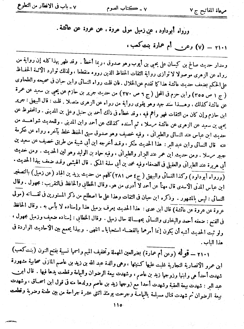 2101- (7) وعن أم عمارة بنت كعب، ((أن النبي صلى الله عليه وسلم دخل عليها، فدعت له بطعام،