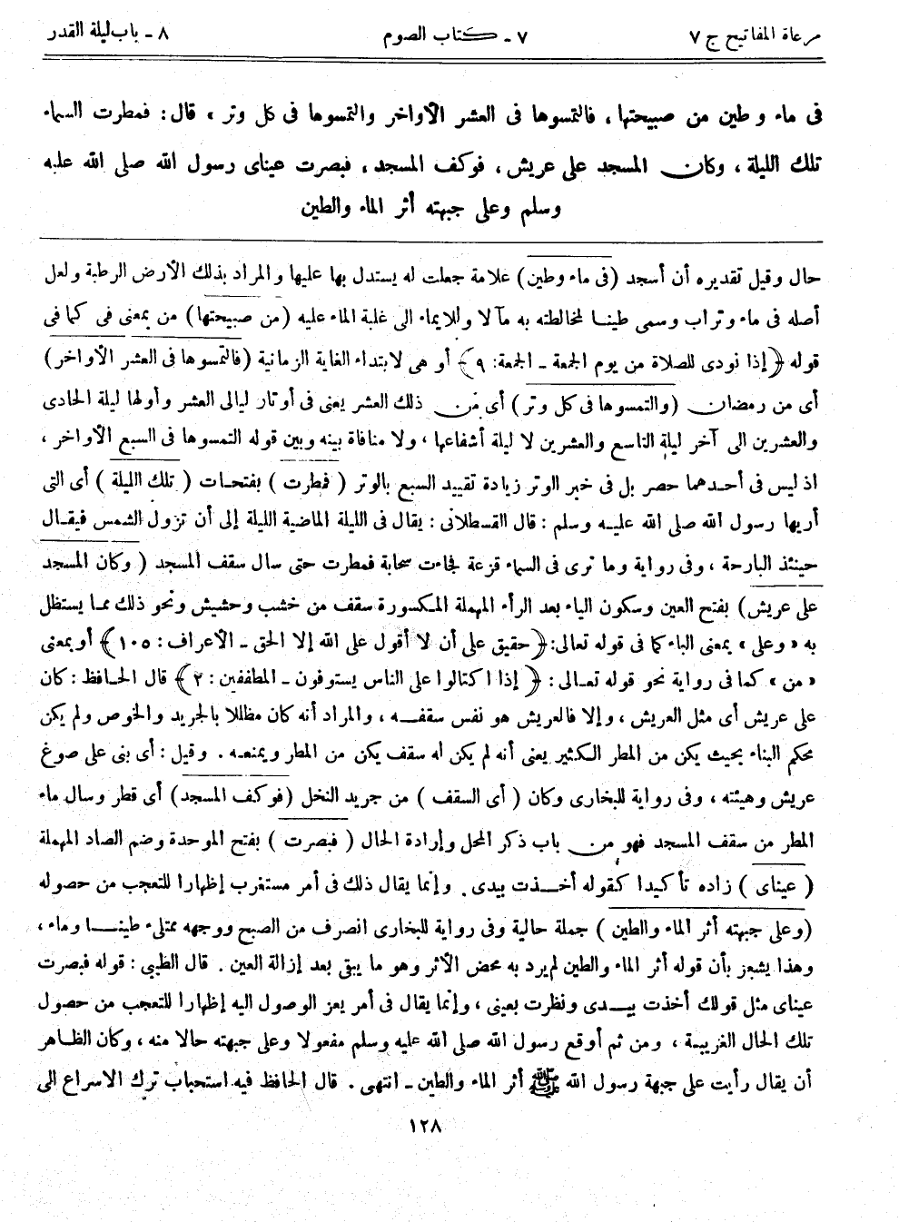 (في ماء وطين) علامة جعلت له يستدل بها عليها والمراد بذلك الأرض الرطبة ولعل أصله في ماء وتراب طيناً لمخالطته به مآلاً وللإيماء إلى غلبة الماء عليه (من صبيحتها) من بمعنى في كما في قوله {إذا نودي للصلاة من يوم الجمعة} [الجمعة: 9] أو هي لابتداء الغاية الزمانية (فالتمسوها في العشر الأواخر) أي من رمضان (والتمسوها في كل وتر) أي من ذلك العشر يعني في أوتار ليالي العشر وأولها ليلة الحادي والعشرين إلى آخر ليلة التاسع والعشرين لا ليلة أشفاعها، ولا منافاة بينه وبين قوله التمسوها في السبع الأواخر، إذ ليس في أحدهما حصر بل في خبر الوتر زيادة تقييد السبع بالوتر (فمطرت) بفتحات (تلك الليلة) أي التي أريها رسول الله صلى الله عليه وسلم: قال القسطلاني: يقال في الليلة الماضية الليلة إلى أن تزول الشمس فيقال حينئذٍ البارحة، وفي رواية وما نرى في السماء قزعة فجاءت سحابة فمطرت حتى سال سقف المسجد (وكان المسجد على عريش) بفتح العين وسكون الياء بعد الراء المهملة المكسورة سقف من خشب وحشيش ونحو ذلك مما يستظل به "وعلى" بمعنى الباء كما في قوله تعالى: {حقيق على أن لا أقول على الله إلا الحق} [الأعراف: 105] أو بمعنى "من" كما في رواية نحو قوله تعالى: {إذا اكتالوا على الناس يستوفون} [المطففين: 2] قال الحافظ: كان على عريش أي مثل العريش، وإلا فالعريش هو نفس سقفه، والمراد أنه كان مظللاً بالجريد والخوص ولم يكن محكم البناء بحيث يكن من المطر الكثير يعني أنه لم يكن له سقف يكن من المطر ويمنعه. وقيل: أي بني على صوغ عريش وهيئته، وفي رواية للبخاري وكان (أي السقف) من جريد النخل (فوكف المسجد) أي قطر وسال ماء المطر من سقف المسجد فهو من باب ذكر المحل وإرادة الحال (فبصرت) بفتح الموحدة وضم الصاد المهملة (عيناي) زاده تأكيداً كقوله أخذت بيدي. وإنما يقال ذلك في أمر مستغرب إظهاراً للتعجب من حصوله (وعلى جبهته أثر الماء والطين) جملة حالية وفي رواية للبخاري انصرف من الصبح ووجهه ممتلىء طيناً وماء، وهذا يشعر بأن قوله أثر الماء والطين لم يرد به محض الأثر وهو ما يبقى بعد إزالة العين. قال الطيبي: قوله فبصرت عيناي مثل قولك أخذت بيدي ونظرت بعيني، وإنما يقال في أمر يعز الوصول إليه إظهاراً للتعجب من حصول تلك الحال الغريبة، ومن ثم أوقع رسول الله صلى الله عليه وسلم مفعولاً وعلى جبهته حالاً منه، وكان الظاهر أن يقال رأيت على جبهة رسول الله - صلى الله عليه وسلم - أثر الماء والطين-انتهى. قال الحافظ فيه استحباب ترك الإسراع إلى إزالة ما يصيب جبهة الساجد من غبار الأرض، وقال أيضاً فيه ترك مسح جبهة المصلي والسجود على الحائل،