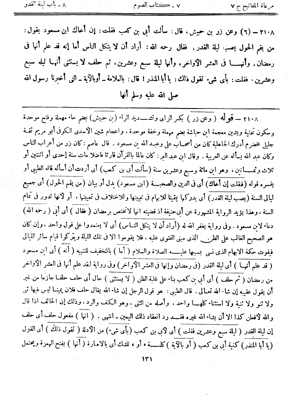 2108- قوله: (وعن زر) بكسر الزاي وتشديد الراء (بن حبيش) بضم حاء مهملة وفتح موحدة وسكون تحتية وبشين معجمة ابن حباشة بضم مهملة وخفة موحدة، واعجام شين الأسدي الكوفي أبومريم ثقة جليل مخضرم أدرك الجاهلية كان من أصحاب علي وعبد الله بن مسعود. قال عاصم: كان زر من أعراب الناس وكان عبد الله يسأله عن العربية. وقال ابن عبد البر: كان عالماً بالقرآن قارئاً فاضلاً مات سنة إحدى أو اثنتين أو ثلاث وثمانين، وهو ابن مائة وسبع وعشرين سنة (سألت أبي بن كعب) أي أردت أن أسأله قاله الطيبي أو يفسره قوله (فقلت ن أخاك) أي في الدين والصحبة (ابن مسعود) بدل أو بيان (من يقم الحول) أي جميع ليالي السنة (يصب ليلة القدر) أي يدركها يقيناً للإبهام في تبيينها وللاختلاف في تعيينها، أو لأنها تدور في تمام السنة، وهذا يؤيد الرواية المشهورة عن أبي حنيفة إذ قضيته إنها لا تختص برمضان (فقال) أي أبي (رحمه الله) دعا لابن مسعود. وفي رواية يغفر الله له (أراد أن يتكل الناس) أي لا يعتمدوا على قول واحد، وإن كان هو الصحيح الغالب على الظن الذي مبني الفتوى عليه، فلا يقوموا إلا في تلك الليلة ويتركوا قيام سائر الليالي فيفوت حكمة الإبهام الذي نسي بسببها عليه الصلاة والسلام (أما) بالتخفيف للتنبيه (أنه) أي ابن مسعود (قد علم أنها) أي ليلة القدر (في رمضان وإنها في العشر الأواخر) وفي رواية لقد علم أنها في العشر الأواخر من رمضان (ثم حلف) أي أبي بن كعب بناء على غلبة الظن (لا يستثنى) حال أي حلف حلفاً جازماً من غير أن يقول عقيبه إن شاء الله تعالى. قال الطيبي: هو قول الرجل إن شاء الله يقال حلف فلان يميناً ليس فيها ثنى ولا ثنو ولا ثنية ولا استثناء كلها واحد، وأصله من الثني، وهو الكف والرد، وذلك إن الحالف إذا قال والله لأفعلن كذا إلا أن يشاء الله غيره فقد رد انعقاد ذلك اليمين-انتهى. (إنها) مفعول حلف أي حلف إن ليلة القدر (ليلة سبع وعشرين فقلت) أي لأبي بن كعب (بأي شيء) من الأدلة (تقول ذلك) أي القول (يا أبا المن1ذر) كنية أبي بن كعب (أو بالآية) كلمة "أو" للشك أي بالإمارة (أنها) بفتح الهمزة ويحتمل الكسر أي أن الشمس (تطلع يومئذ) أي يوم إذ تكون تلك الليلة ليلة القدر،