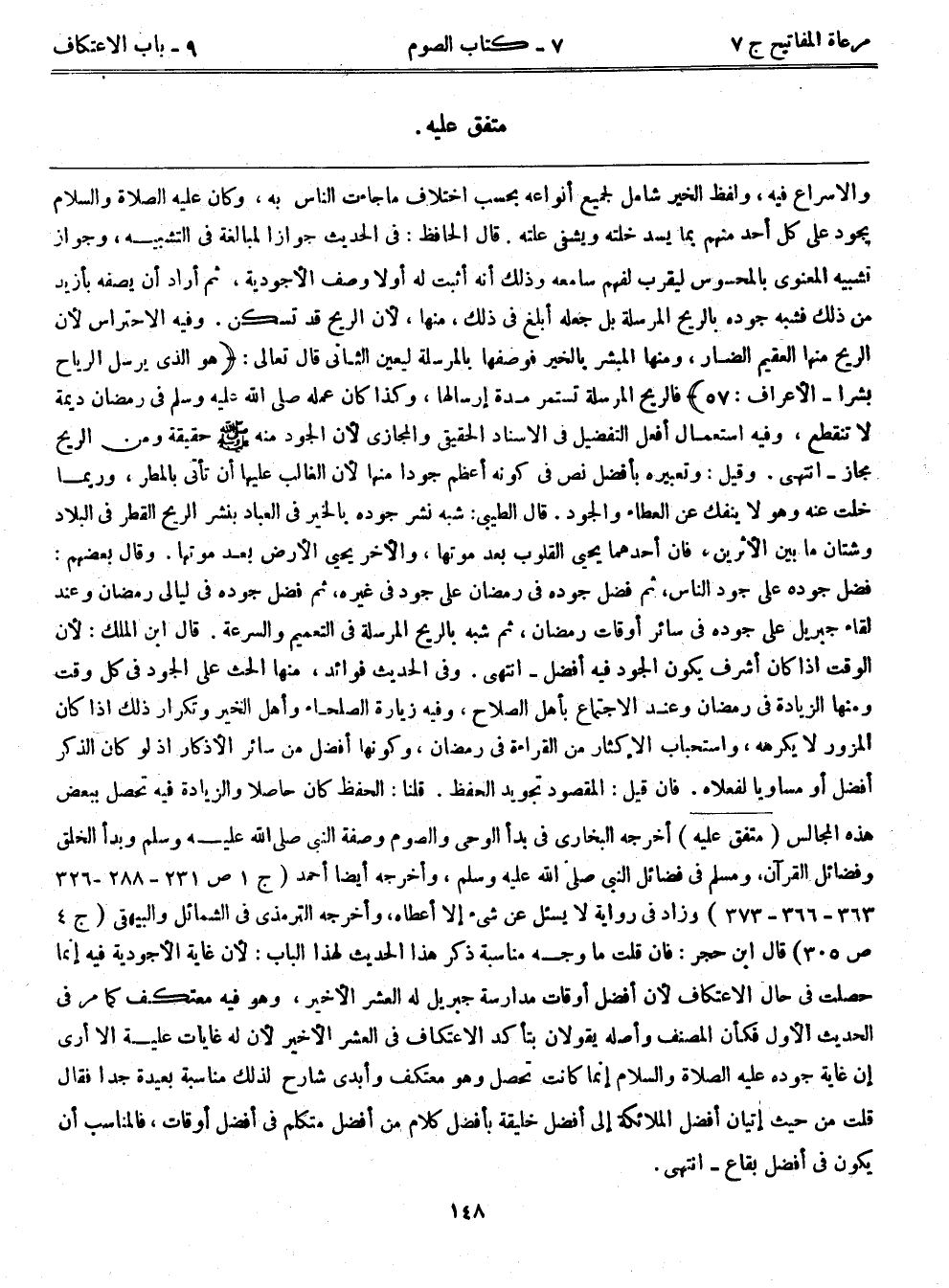 ولفظ الخير شامل لجميع أنواعه بحسب إختلاف ما جاءت الناس به، وكان عليه الصلاة والسلام يجود على كل أ؛ د منهم بما يسد خلته ويشفى علته. قال الحافظ: في الحديث جوازاً لمبالغة في التشبيه، وجواز تشبيه المعنوي بالمحسوس ليقرب لفهم سامعه وذلك أنه أثبت له أولاً وصف الأجودية، ثم أراد أن يصفه بأزيد من ذلك فشبه جوده بالريح المرسلة بل جعله أبلغ في ذلك، منها، لأن الريح قد تسكن. وفيه الاحتراس لأن الريح منها العقيم الضار، ومنها المبشر بالخير فوصفها بالمرسلة ليعين الثاني قال تعالى: {هو الذي يرسل الرياح بشراً} [الأعراف:57] فالريح المرسلة تستمر مدة إرسالها، وكذا كان عمله صلى الله عليه وسلم في رمضان ديمة لا تنقطع، وفيه استعمال أفعل التفضيل في الإسناد الحقيقي والمجازي لأن الجود منه - صلى الله عليه وسلم - حقيقة ومن الريح مجاز-انتهى. وقيل: وتعبيره بأفضل نص في كونه أعظم جوداً منها لأن الغالب عليها أن تأتي بالمطر، وربما خلت عنه وهو لا ينفك عن العطاء والجود. قال الطيبي: شبه نشر جوده بالخير في العباد بنشر الريح القطر في البلاد وشتان ما بين الأثرين، فإن أحدهما يحيى القلوب بعد موتها، والأخر يحيى الأرض بعد موتها. وقال بعضهم: فضل جوده على جود الناس، ثم فضل جوده في رمضان على جود في غيره، ثم فضل جوده في ليالي رمضان وعند لقاء جبريل على جوده في سائر أوقات رمضان، ثم شبه بالريح المرسلة في التعميم والسرعة. قال ابن الملك: لأن الوقت إذا كان أشرف يكون الجود فيه أفضل-انتهى. وفي الحديث فوائد، منها الحث على الجود في كل وقت ومنها الزيادة في رمضان وعند الاجتماع بأهل الصلاح، وفيه زيارة الصلحاء وأهل الخير وتكرار ذلك إذا كان المزور لا يكرهه، واستحباب الإكتثار من القراءة في رمضان، وكونها أفضل من سائر الأذكار إذ لو كان الذكر أفضل أو مساوياً لفعلاه. فإن قيل: المقصود تجويده الحفظ. قلنا: الحفظ كان حاصلاً والزيادة فيه تحصل ببعض هذه المجالس (متفق عليه) أخرجه البخاري في بدأ الوحي والصوم وصفة النبي صلى الله عليه وسلم وبدأ الخلق وفضائل القرآن، ومسلم في فضائل النبي صلى الله عليه وسلم، وأخرجه أيضاً أحمد (ج1:ص231-288-326-363-366-373) وزاد في رواية لا يسئل عن شيء إلا أعطاه، وأخرجه الترمذي في الشمائل والبيهقي (ج4:ص305) قال ابن حجر: فإن قلت ما وجه مناسبة ذكر هذا الحديث لهذا الباب: لأن غاية الأجودية فيه إنما حصلت في حال الاعتكاف لأن أفضل أوقات مدارسة جبريل له العشر الأخير، وهو فيه معتكف كما مر في الحديث الأول فكأن المصنف وأصله يقولان بتأكد الاعتكاف في العشر الأخير لأن له غايات علية إلا أرى إن غاية جوده عليه الصلاة والسلام إنما كانت تحصل وهو معتكف وأبدى شارح لذلك مناسبة بعيدة جداً فقال قلت من حيث إتيان أفضل الملائكة إلى أفضل خليقة بأفضل كلام من أفضل متكلم في أفضل أوقات، فالمناسب أن يكون في أفضل بقاع-انتهى.