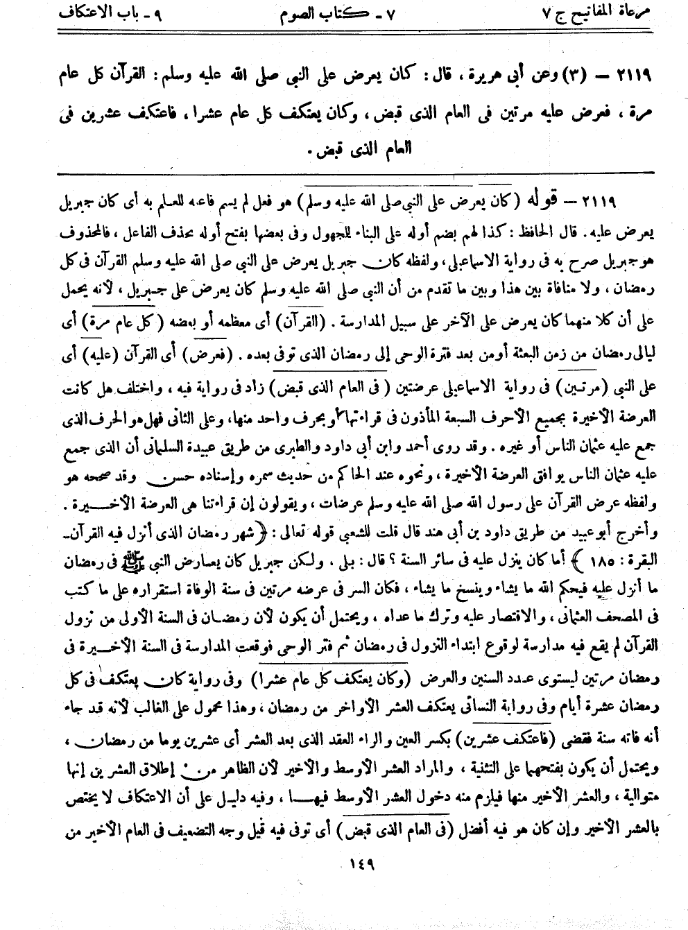 2119- (3) وعن أبي هريرة، قال: ((كان يعرض على النبي صلى الله عليه وسلم: القرآن كل عام مرة، فعرض عليه مرتين في العام الذي قبض، وكان يعتكف كل عام عشراً، فاعتكف عشرين في العام الذي قبض))