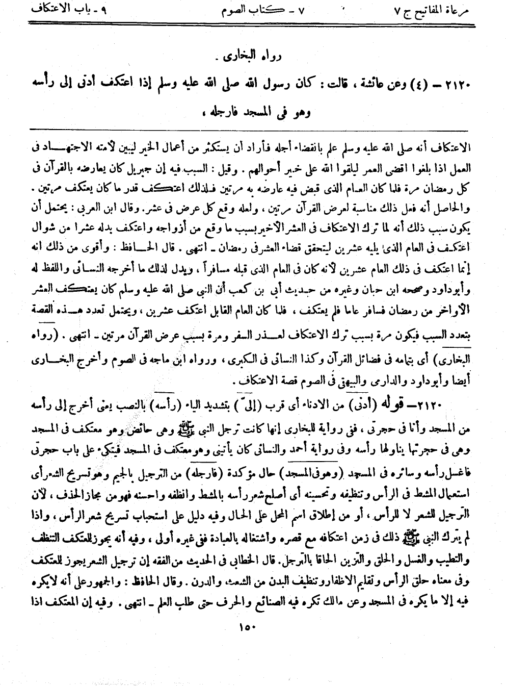 2120- قوله: (أدنى) من الإدناء أي قرب (إليّ) بتشديد الياء (رأسه بالنصب يعني أخرج إلى رأسه من المسجد وأنا في حجرتي، ففي رواية للبخاري إنها كانت ترجل النبي - صلى الله عليه وسلم - وهي حائض وهو معتكف في المسجد وهي في حجرتها يناولها رأسه وفي رواية أحمد والنسائي كان يأتيني وهو معتكف في المسجد فيتكئ على باب حجرتي فاغسل رأسه وسائره في المسجد (وهو في المسجد) حال مؤكده) (فأرجله) من الترجيل بالجيم وهو تسريح الشعر أي استعمال المشط في الرأس وتنظيفه وتحسينه أي أصلح شعر رأسه بالمشط وأنظفه وأحسنه فهو من مجاز الحذف، لأن الترجيل للشعر لا للرأس، أو من إطلاق اسم المحل على الحال وفيه دليل على استحباب تسريح شعر الرأس، وإذا لم يترك النبي - صلى الله عليه وسلم - ذلك في زمن اعتكافه مع قصره واشتغاله بالعبادة ففي غيره أولى، وفيه أنه يجوز للمعتكف التنظيف والتطيب والغسل والحلق والتزين إلحاقاً بالترجل. قال الخطابي في الحديث من الفقه: إن ترجيل الشعر يجوز للمعتكف وفي معناه حلق الرأس وتقليم الأظفار وتنظيف البدن من الشعث والدرن. وقال الحافظ: والجمهور على أنه لا يكره فيه إلا ما يكره في المسجد وعن مالك تكره فيه الصنائع والحرف حتى طلب العلم- انتهى. وفيه إن المعتكف إذا