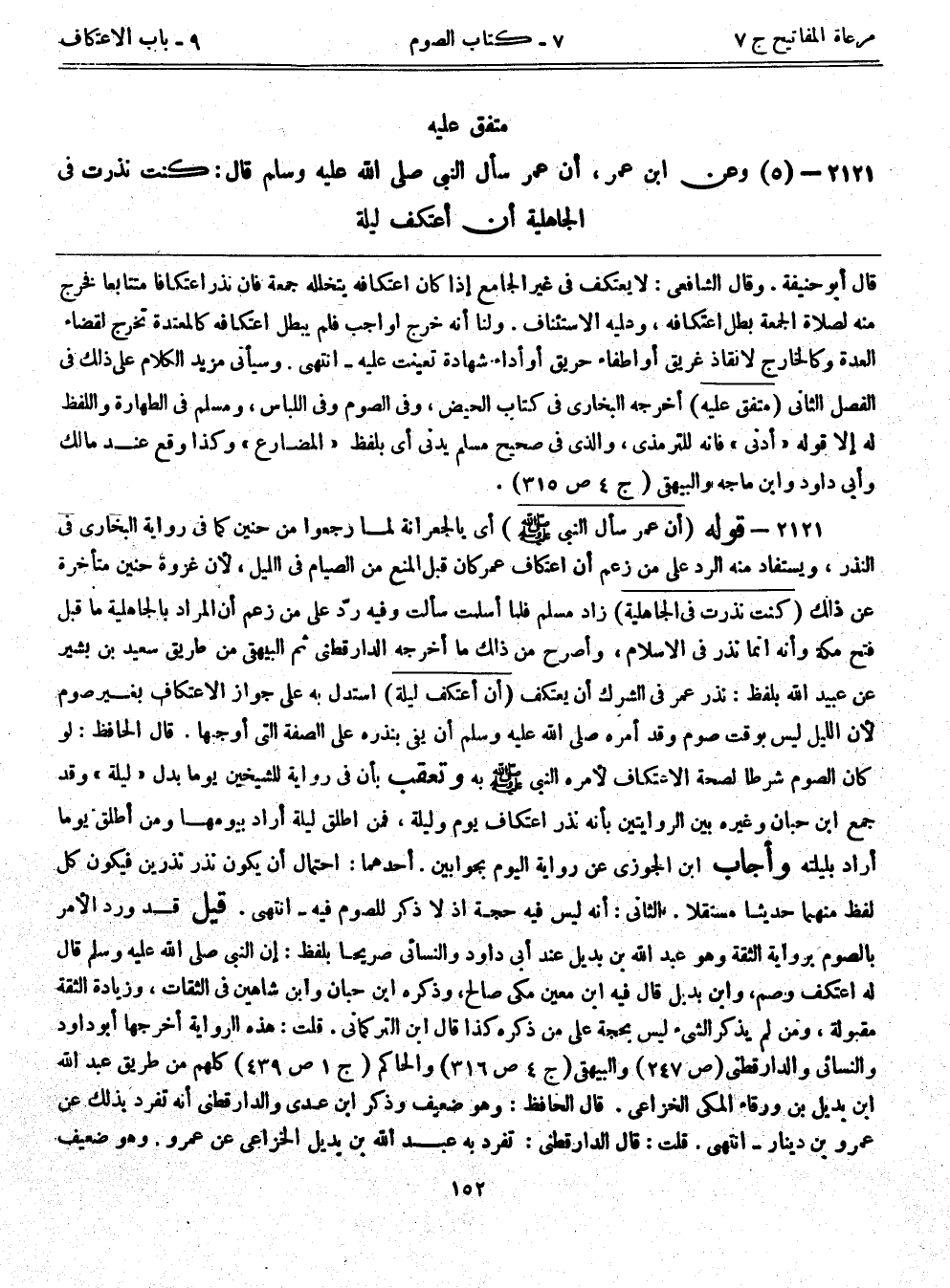 2121 - (5) وعن ابن عمر، أن عمر سأل النبي صلى الله عليه وسلم قال: ((كنت نذرت في الجاهلية أن اعتكف ليلة