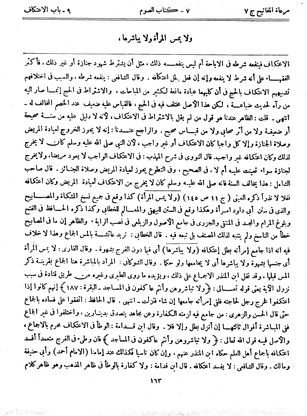 الاعتكاف فينفعه شرطه في الإباحة أم ليس ينفعه ذلك، مثل أن يشترط شهود جنازة أو غير ذلك، فأكثر الفقهاء على أنه شرط لا ينفعه وإنه إن فعل بطل اعتكافه. وقال الشافعي: ينفعه شرطه، والسبب في اختلافهم تشبيههم الاعتكاف بالحج في أن كليهما عبادة مانعة لكثير من المباحات، والاشتراط في الحج إنما صار إليه من رآه لحديث ضباعة، لكن هذا الأصل مختلف فيه في الحج، فالقياس عليه ضعيف عند الخصم المخالف له- انتهى. قلت: الظاهر عندنا هو قول من لم يقل بالاشتراط في الاعتكاف، لأنه لا دليل عليه من سنة صحيحة أو ضعيفة ولا من أثر صحابي ولا من قياس صحيح. والراجح عندنا: إنه لا يجوز الخروج لعيادة المريض وصلاة الجنازة وإلا كل واجباً كان الاعتكاف أو غير واجب، لأن النبي صلى الله عليه وسلم كان لا يخرج لذلك وكان اعتكافه غير واجب. قال النووي في شرح المهذب: في الاعتكاف الواجب لا يعود مريضاً، ولا يخرج لجنازة سواءً تعينت عليه أم لا، في الصحيح، وفي التطوع يجوز لعيادة المريض وصلاة الجنائز. قال صاحب الشامل: هذا يخالف السنة فإنه صلى الله عليه وسلم كان لا يخرج من الاعتكاف لعيادة المريض وكان اعتكافه نفلاً لا نذراً ذكره العيني (ج11ص145) (ولا يمس المرأة) كذا وقع في جميع نسخ المشكاة والمصابيح والذي في سنن أبي داود امرأة وهكذا وقع في السنن للبيهقي والمعالم للخطابي وكذا ذكره الحافظ في الفتح وبلوغ المرام والمجد في المنتقى والجزري في جامع الأصول والزيلعي في نصب الراية، والظاهر إن ما في المصابيح خطأ من الناسخ ولم يتنبه لذلك المصنف بل تبعه فيه. قال الخطابي: تريد عائشة بالمس الجماع وهذا لا خلاف فيه إنه إذا جامع امرأته بطل اعتكافه (ولا يباشرها) أي فيما دون الفرج بشهوة. وقال القاري: لا يمس المرأة أي جنسها بشهوة ولا يباشرها أي لا يجامعها ولو حكماً. وقال الشوكاني: المراد بالمباشرة هنا الجماع بقرينة ذكر المس قبلها، وقد نقل ابن المنذر الإجماع على ذلك، ويؤيده ما روى الطبري وغيره من طريق قتادة في سبب نزول الآية يعني قوله تعالى: {ولا تباشروهن وأنتم عاكفون في المساجد} [البقرة: 187] إنهم كانوا إذا اعتكفوا فخرج رجل لحاجته فلقي امرأته جامعها إن شاء فنزلت- انتهى. قال الحافظ: اتفقوا على فساده بالجماع حتى قال الحسن والزهري: من جامع فيه لزمته الكفارة وعن مجاهد يتصدق بدينارين، واختلفوا في غير الجماع ففي المباشرة أقوال ثالثها إن أنزل بطل وإلا فلا. وقال ابن قدامة: الوطأ في الاعتكاف محرم بالإجماع، والأصل فيه قول الله تعالى: {ولا تباشروهن وأنتم عاكفون في المساجد] فإن وطيء في الفرج متعمداً أفسد اعتكافه بإجماع أهل العلم حكاه ابن المنذر عنهم، وإن كان ناسياً فكذلك عند إمامنا (الإمام أحمد) وأبي حنيفة ومالك. وقال الشافعي: لا يفسد اعتكافه. قال ابن قدامة: ولا كفارة بالوطأ في ظاهر المذهب وهو ظاهر كلام