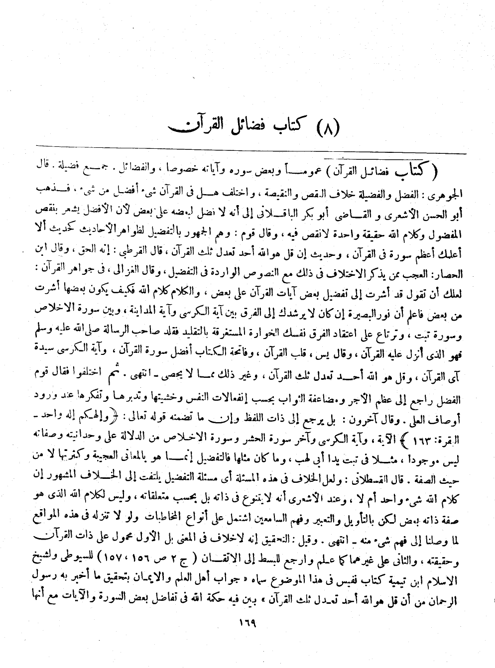 (كتاب فضائل القرآن) عموماً وبعض سوره وآياته خصوصاً، والفضائل. جمع فضيلة. قال الجوهري: الفضل والفضيلة خلاف النقص والنقيصة، واختلف هل في القرآن شي أفضل من شي، فذهب أبوالحسن الأشعري والقاضي أبوبكر الباقلاني إلى أنه لا فضل لبعضه على بعض لأن الأفضل يشعر بنقص المفضول وكلام الله حقيقة واحدة لا نقص فيه، وقال قوم: وهم الجمهور بالتفضيل لظواهر الأحاديث كحديث ألا أعلمك أعظم سورة في القرآن، وحديث إن قل هو الله أحد تعدل ثلث القرآن، قال القرطبي: إنه الحق، وقال ابن الحصار: العجب ممن يذكر الاختلاف في ذلك مع النصوص الواردة في التفضيل، وقال الغزالي، في جواهر القرآن: لعلك أن تقول قد أشرت إلى تفضيل بعض آيات القرآن على بعض، والكلام كلام الله فكيف يكون بعضها أشرت من بعض فاعلم أن نور البصيرة إن كان لا يرشدك إلى الفرق بين آية الكرسي وآية المداينة، وبين سورة الإخلاص وسورة تبت، وترتاع على اعتقاد الفرق نفسك الخوارة المستغرقة بالتقليد فقلد صاحب الرسالة صلى الله عليه وسلم فهو الذي أنزل عليه القرآن، وقال يس، قلب القرآن، وفاتحة الكتاب أفضل سورة القرآن، وآية الكرسي سيدة آي القرآن، وقل هو الله أحد تعدل ثلث القرآن، وغير ذلك مما لا يحصى- انتهى. ثم اختلفوا فقال قوم الفضل راجع إلى عظم الأجر ومضاعفة الثواب بحسب إنفعالات النفس وخشيتها وتدبرها وتفكرها عند ورود أوصاف العلى. وقال آخرون: بل يرجع إلى ذات اللفظ وإن ما تضمنه قوله تعالى: {وإلهكم إله واحد} الآية، [البقرة: 163] وآية الكرسي وآخر سورة الحشر وسورة الإخلاص من الدلالة على وحدانيته وصفاته ليس موجوداً، مثلاً في تبت يدا أبي لهب، وما كان مثلها فالتفضيل إنما هو بالمعاني العجيبة وكثرتها لا من حيث الصفة. قال القسطلاني: ولعل الخلاف في هذه المسألة أي مسألة التفضيل يلتفت إلى الخلاف المشهور إن كلام الله شي واحد أم لا، وعند الأشعري أنه لا يتنوع في ذاته بل بحسب متعلقاته، وليس لكلام الله الذي هو صفة ذاته بعض لكن بالتأويل والتعبير وفهم السامعين اشتمل على أنواع المخاطبات ولولا تنزله في هذه المواقع لما وصلنا إلى فهم شي منه-انتهى. وقيل: التحقيق إنه لا خلاف في المعنى بل الأول محمول على ذات القرآن وحقيقته، والثاني على غيرهما كما علم وارجع للبسط إلى الإتقان (ج2ص156، 157) للسيوطي ولشيخ الإسلام ابن تيمية كتاب نفيس في هذا الموضوع سماه "جواب أهل العلم والإيمان بتحقيق ما أخبر به رسول الرحمان من أن قل هو الله أحد تعدل ثلث القرآن" بين فيه حكمة الله في تفاضل بعض السورة والآيات مع أنها