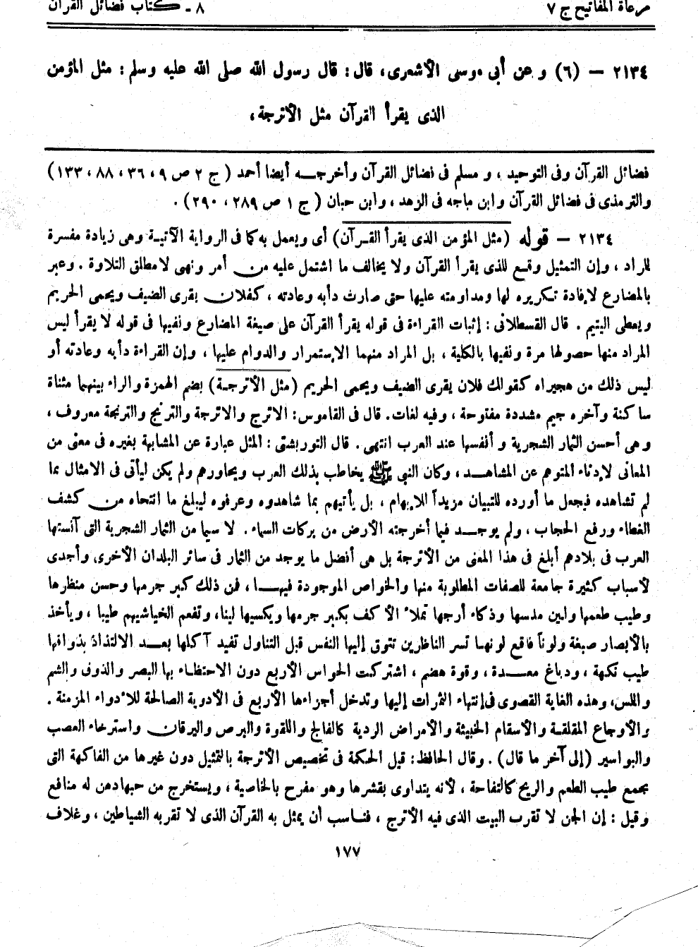 2134- (6) وعن أبي موسى الأشعري، قال: قال رسول الله صلى الله عليه وسلم: ((مثل المؤمن الذي يقرأ القرآن مثل الأترجة،