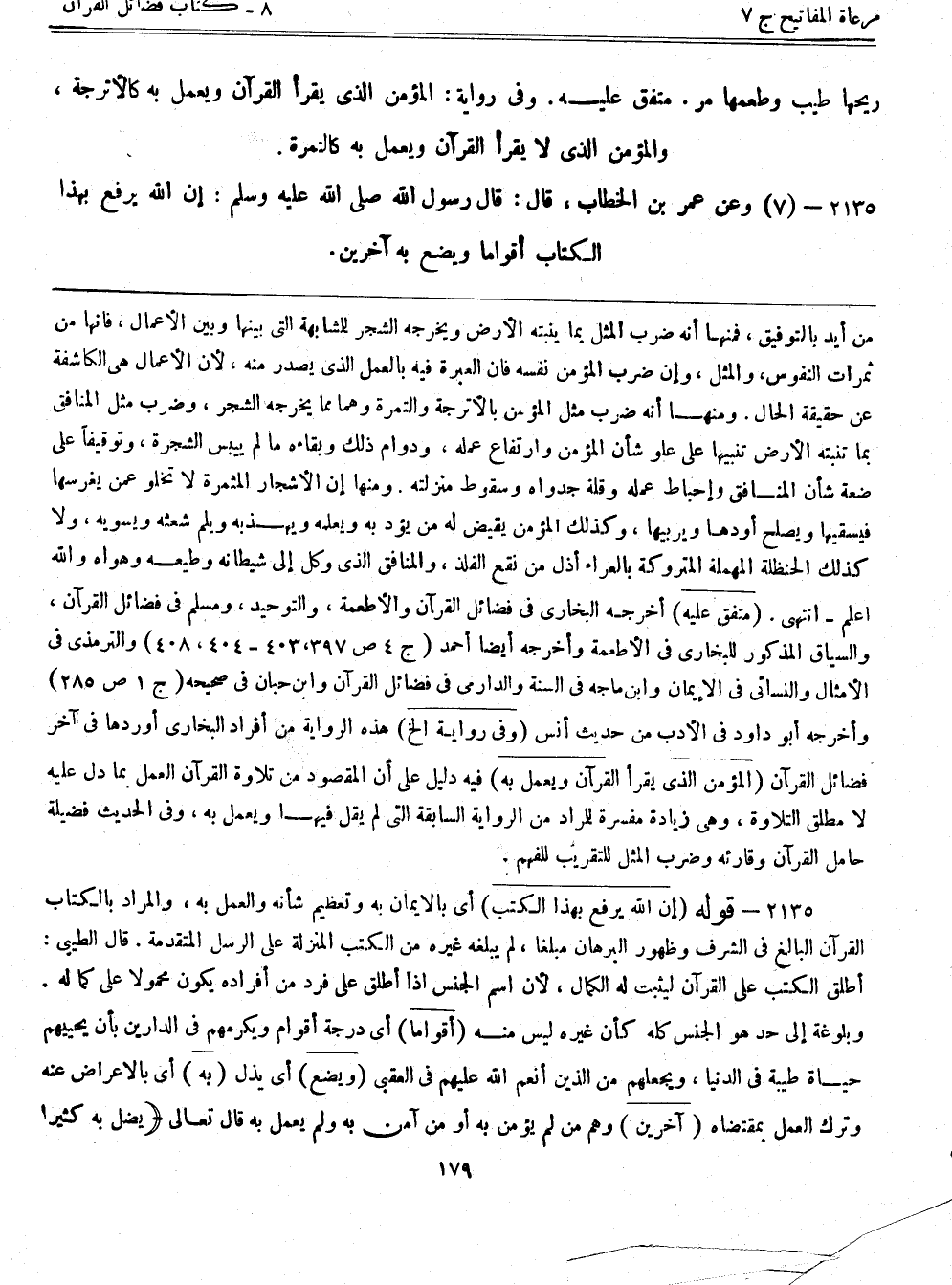2135- (7) وعن عمر بن الخطاب، قال: قال رسول الله صلى الله عليه وسلم: ((إن الله يرفع بهذا الكتاب أقواماً ويضع به آخرين)) .
