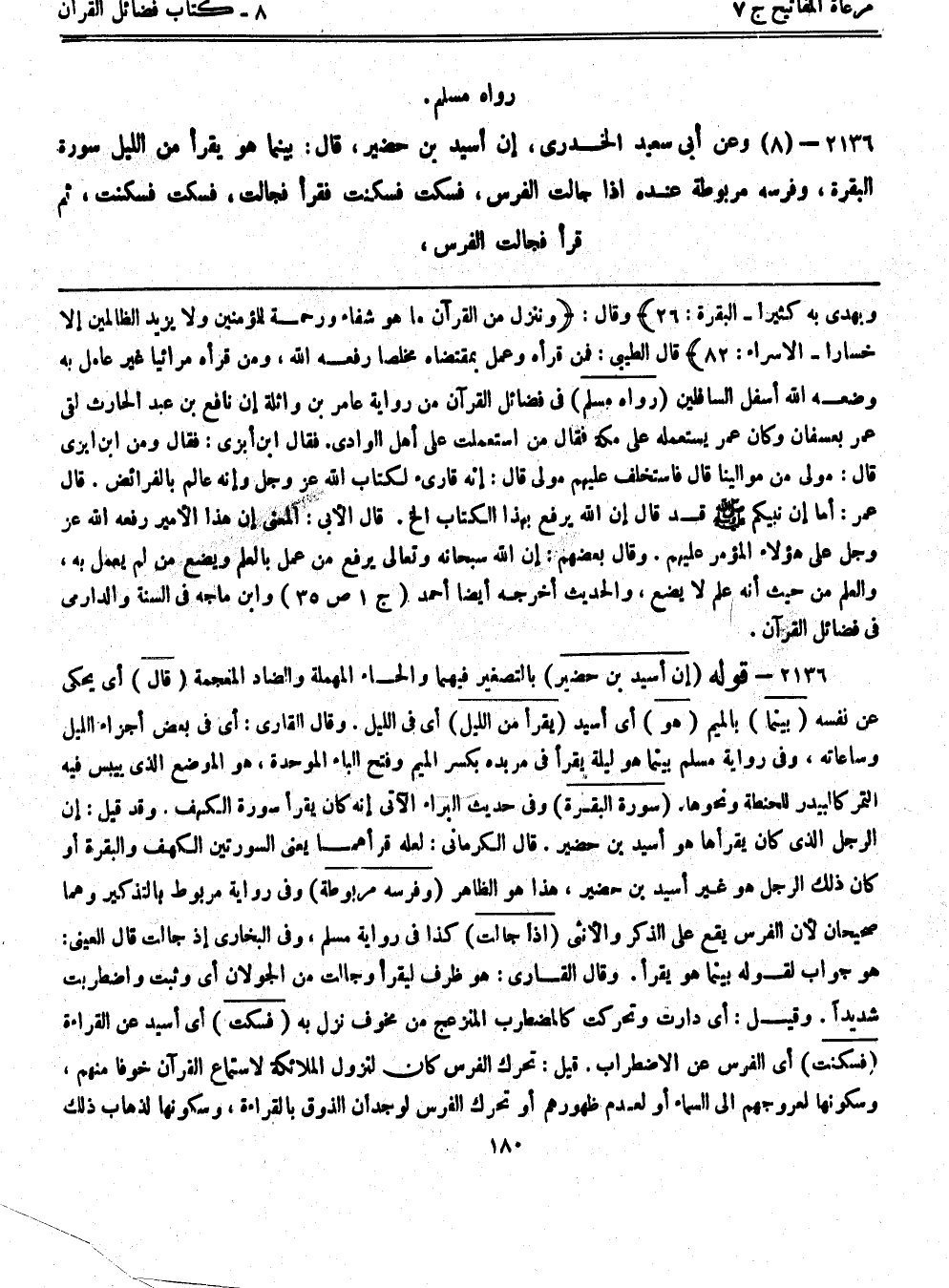 2136 - (8) وعن أبي سعيد الخدري، إن أسيد بن حضير، قال: ((بينما هو يقرأ من الليل سورة البقرة، وفرسه مربوطة عنده إذا جالت الفرس، فسكت فسكنت فقرأ فجالت، فسكت فسكنت، ثم قرأ فجالت الفرس،