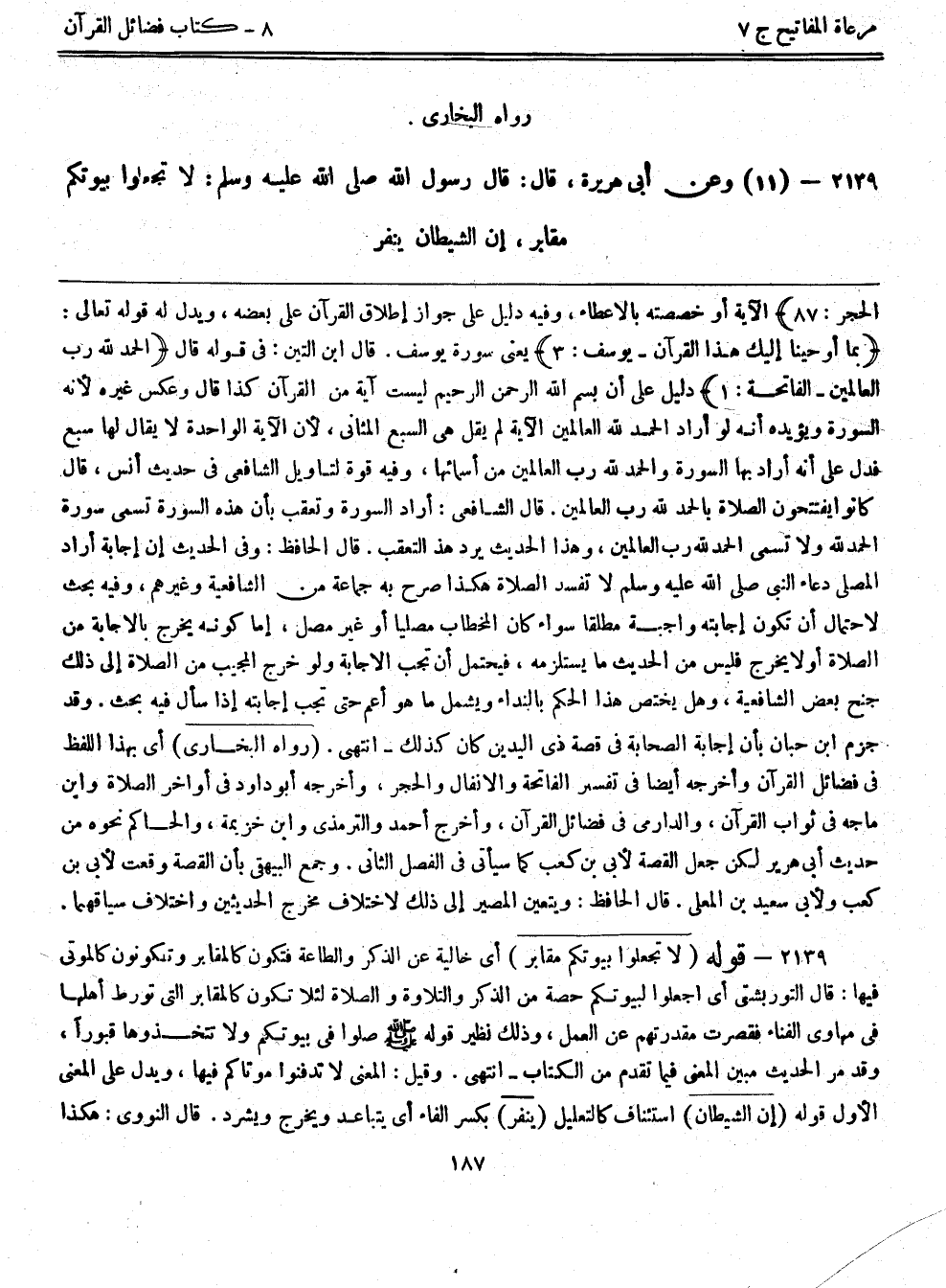 2139-قوله: (لا تجعلوا بيوتكم مقابر) أي خالية عن الذكر والطاعة فتكون كالمقابر وتكونون كالموتى فيها قال التوربشتي: أي اجعلوا لبيوتكم حصة من الذكر والتلاوة والصلاة لئلا تكون كالمقابر التي تورط أهلها في مهاوي الفناء فقصرت مقدرتهم عن العمل، وذلك نظير قوله - صلى الله عليه وسلم - صلوا في بيوتكم ولا تتخذوها قبوراً، وقد مر الحديث مبين المعنى فيما تقدم من الكتاب- انتهى. وقيل: المعنى لا تدفنوا موتاكم فيها، ويدل على المعنى الأول قوله (إن الشيطان) استئناف كالتعليل (ينفر) بكسر الفاء أي يتباعد ويخرج ويشرد. قال النووي: هكذا