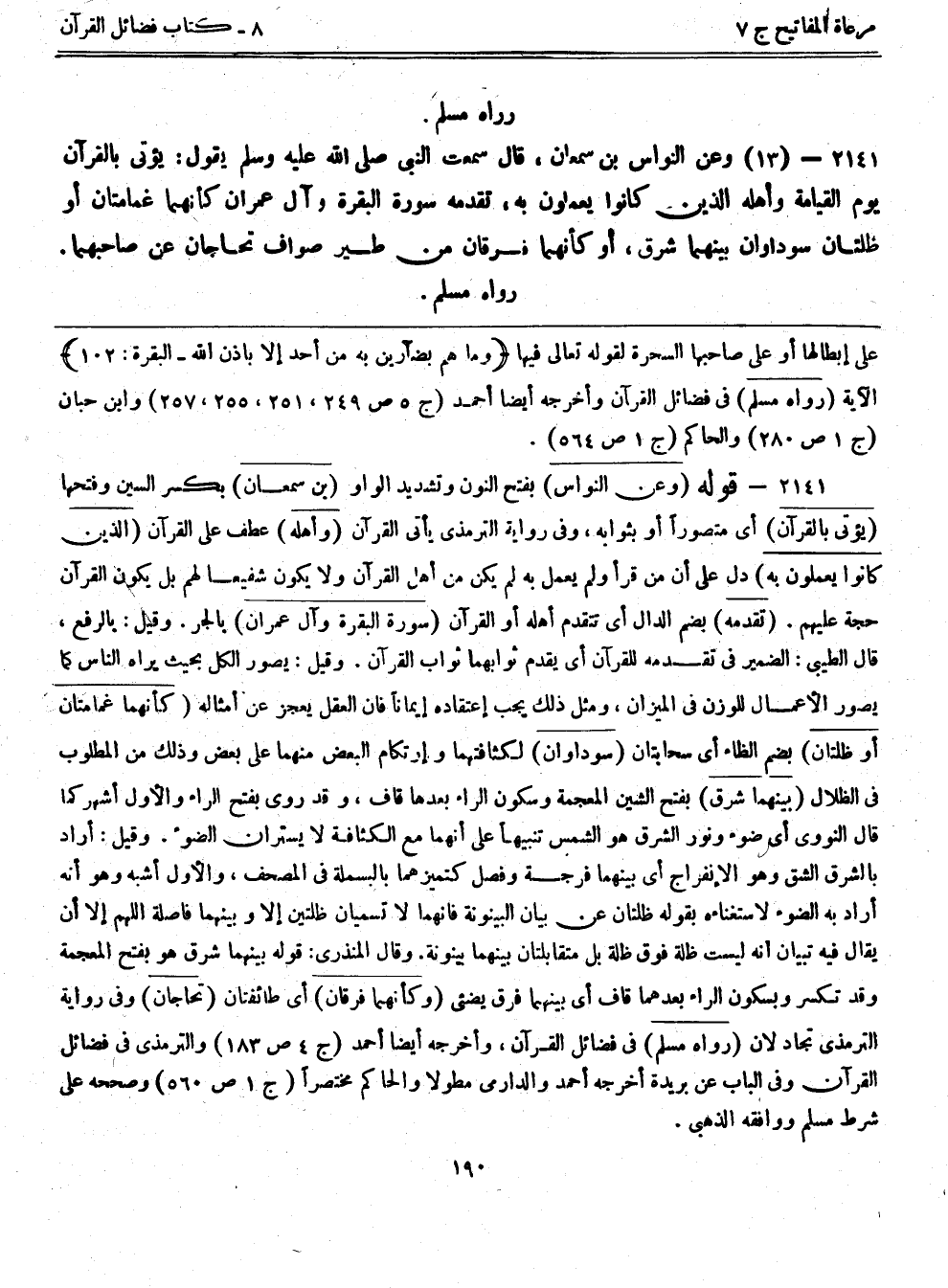 2141- قوله: (وعن النواس) بفتح النون وتشديد الواو (بن سمعان) بكسر السين وفتحها (يؤتي بالقرآن) أي متصوراً أو بثوابه، وفي رواية الترمذي يأتي القرآن (وأهله) عطف على القرآن (الذين كانوا يعملون به) دل على أن من قرأ ولم يعمل به لم يكن من أهل القرآن ولا يكون شفيعاً لهم بل يكون القرآن حجة عليهم. (تقدمه) بضم الدال أي تتقدم أهله أو القرآن (سورة البقرة وآل عمران) بالجر. وقيل: بالرفع، قال الطيبي: الضمير في تقدمه للقرآن أي يقدم ثوابهما ثواب القرآن. وقيل: يصور الكل بحيث يراه الناس كما يصور الأعمال للوزن في الميزان، ومثل ذلك يجب إعتقاده إيماناً فإن العقل يعجز عن أمثاله (كأنهما غمامتان أو ظلتان) بضم الظاء أي سحابتان (سوداوان) لكثافتهما وارتكام البعض منهما على بعض وذلك من المطلوب في الظلال (بينهما شرق) بفتح الشين المعجمة وسكون الراء بعدها قاف، وقد روى بفتح الراء والأول أشهر كما قال النووي أي ضوء ونور الشرق هو الشمس تنبيهاً على أنهما مع الكثافة لا يستران الضوء. وقيل: أراد بالشرق الشق وهو الإنفراج أي بينهما فرجة وفصل كتميزهما بالبسملة في المصحف، والأول أشبه وهو أنه أراد به الضوء لاستغناءه بقوله ظلتان عن بيان البينونة فإنهما لا تسميان ظلتين إلا وبينهما فاصلة اللهم إلا أن يقال فيه تبيان أنه ليست ظلة فوق ظلة بل متقابلتان بينهما بينونة. وقال المنذري: قوله بينهما شرق هو بفتح المعجمة وقد تكسر وبسكون الراء بعدهما قاف أي بينهما فرق يضيء (وكأنهما فرقان) أي طائفتان (تحاجان) وفي رواية الترمذي تجادلان (رواه مسلم) في فضائل القرآن، وأخرجه أيضاً أحمد (ج4ص183) والترمذي في فضائل القرآن وفي الباب عن بريدة أخرجه أحمد والدارمي مطولاً والحاكم مختصراً (ج1ص560) وصححه على شرط مسلم ووافقه الذهبي.