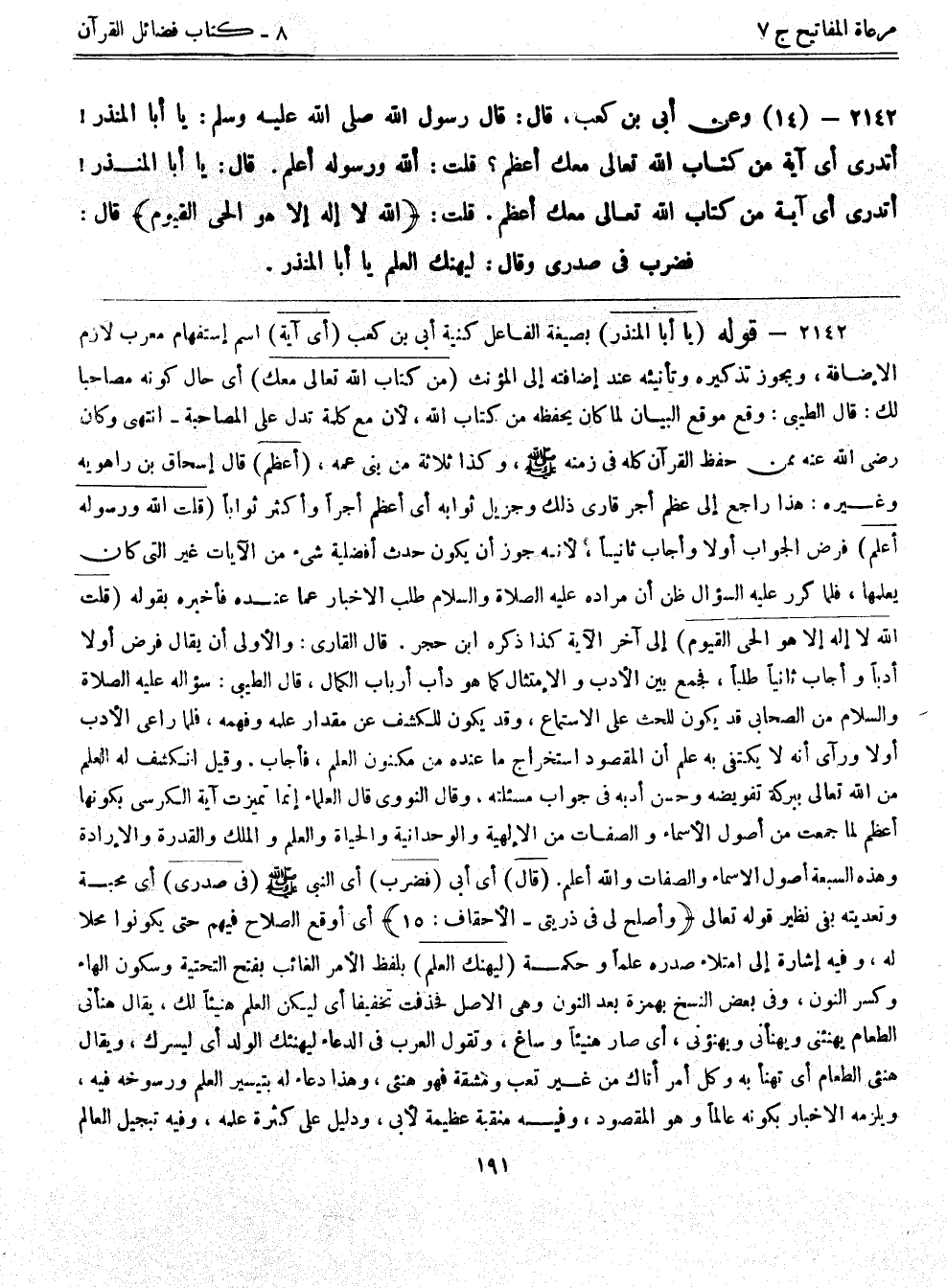 2142- قوله: (يا أبا المنذر) بصيغة الفاعل كنية أبي بن كعب (أي آية) اسم إستفهام معرب لازم الإضافة، ويجوز تذكيره وتأنيثه عند إضافته إلى المؤنث (من كتاب الله تعالى معك) أي حال كونه مصاحباً لك قال الطيبي: وقع موقع البيان لما كان يحفظه من كتاب الله، لأن مع كلمة تدل على المصاحبة- انتهى. وكان رضي الله عنه ممن حفظ القرآن كله في زمنه - صلى الله عليه وسلم -، وكذا ثلاثة من بني عمه، (أعظم) قال إسحاق بن راهوية وغيره: هذا راجع إلى عظم أجر قاري ذلك وجزيل ثوابه أي أعظم أجراً وأكثر ثواباً (قلت الله ورسوله أعلم) فرض الجواب أولاً وأجاب ثانياً، لأنه جوز أن يكون حدث أفضلية شي من الآيات غير التي كان يعلمها، فلما كرر عليه السؤال ظن أن مراده عليه الصلاة والسلام طلب الإخبار عما عنده فأخبره بقوله (قلت الله لا إله إلا هو الحي القيوم) إلى آخر الآية كذا ذكره ابن حجر. قال القاري: والأولى أن يقال فرض أولاً أدباً وأجاب ثانياً طلباً، فجمع بين الأدب والإمتثال كما هو دأب أرباب الكمال، قال الطيبي: سؤاله عليه الصلاة والسلام من الصحابي قد يكون للحث على الاستماع، وقد يكون للكشف عن مقدار علمه وفهمه، فلما راعى الأدب أولاً ورآى أنه لا يكتفي به علم أن المقصود استخراج ما عنده من مكنون العلم، فأجاب. وقيل انكشف له العلم من الله تعالى ببركة تفويضه وحسن أدبه في جواب مسألته، وقال النووي قال العلماء إنما تميزت آية الكرسي بكونها أعظم لما جمعت من أصول الأسماء والصفات من الإلهية والوحدانية والحياة والعلم والملك والقدرة والإرادة وهذه السبعة أصول الأسماء والصفات والله أعلم. (قال) أي أبي (فضرب) أي النبي - صلى الله عليه وسلم - (في صدري) أي محبة وتعديته بفي نظير قوله تعالى {وأصلح لي في ذريتي} [الأحقاف: 15] أي أوقع الصلاح فيهم حتى يكونوا محلاً له، وفيه إشارة إلى امتلاء صدره علماً وحكمة (ليهنك العلم) بلفظ الأمر الغائب بفتح التحتية وسكون الهاء وكسر النون، وفي بعض النسخ بهمزة بعد النون وهي الأصل فحذفت تخفيفاً أي ليكن العلم هنيئاً لك، يقال هنأني الطعام يهنئني ويهنأني ويهنوني، أي صار هنيئا وساغ، وتقول العرب في الدعاء ليهنئك الولد أي ليسرك، ويقال هنئي الطعام أي تهنأ به وكل أمر أتاك من غير تعب ومشقة فهو هنيء، وهذا دعاء له بتيسير العلم ورسوخه فيه، ويلزمه الإخبار بكونه عالماً وهو المقصود، وفيه منقبة عظيمة لأبي، ودليل على كثرة علمه. وفيه تبجيل العالم