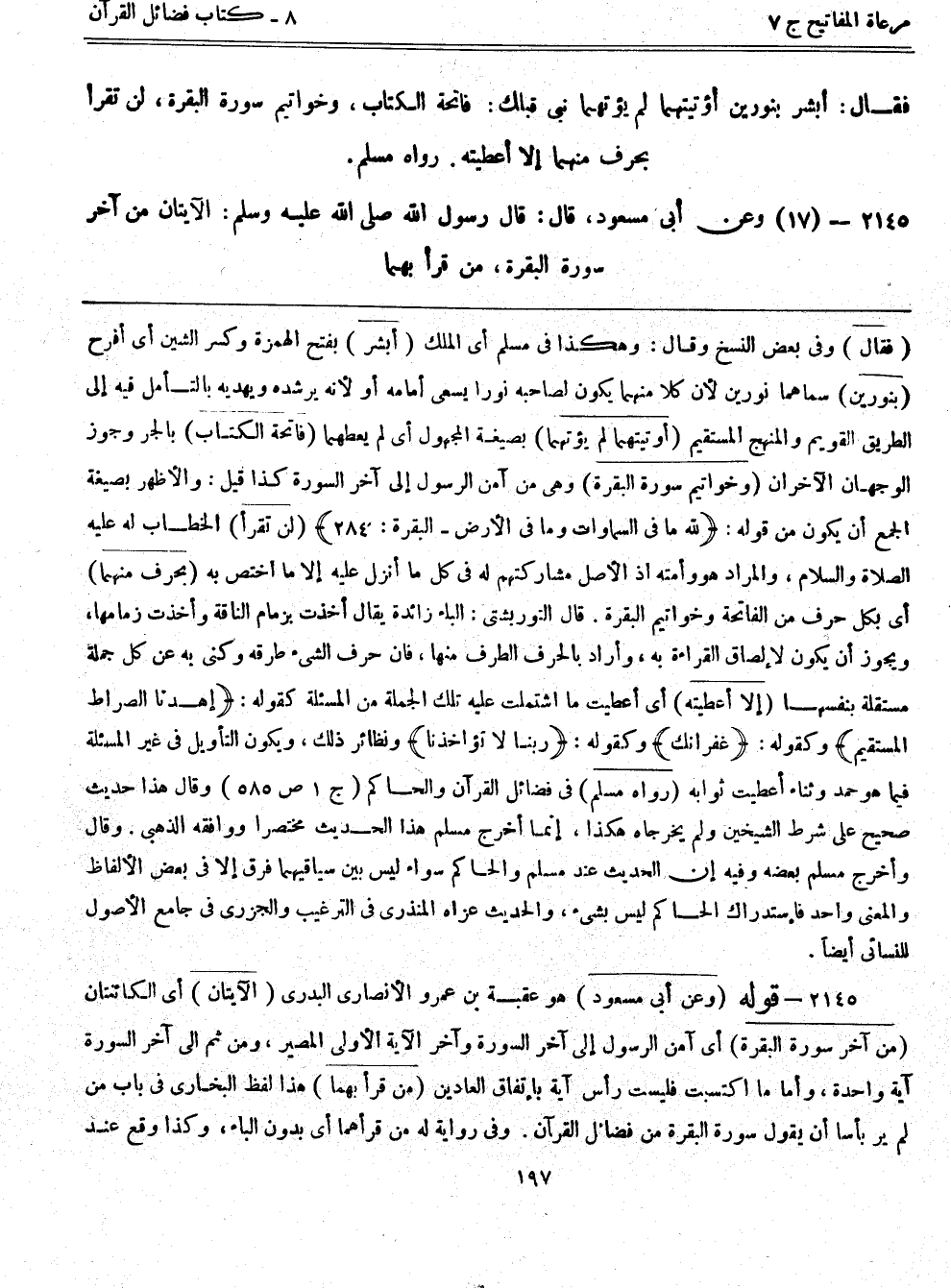 2145- (17) وعن أبي مسعود، قال: ((قال رسول الله صلى الله عليه وسلم: الآيتان من آخر سورة البقرة، من قرأ بهما