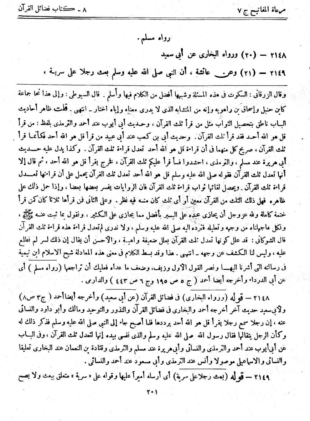 2149- (21) وعن عائشة، ((أن النبي صلى الله عليه وسلم بعث رجلاً على سرية،