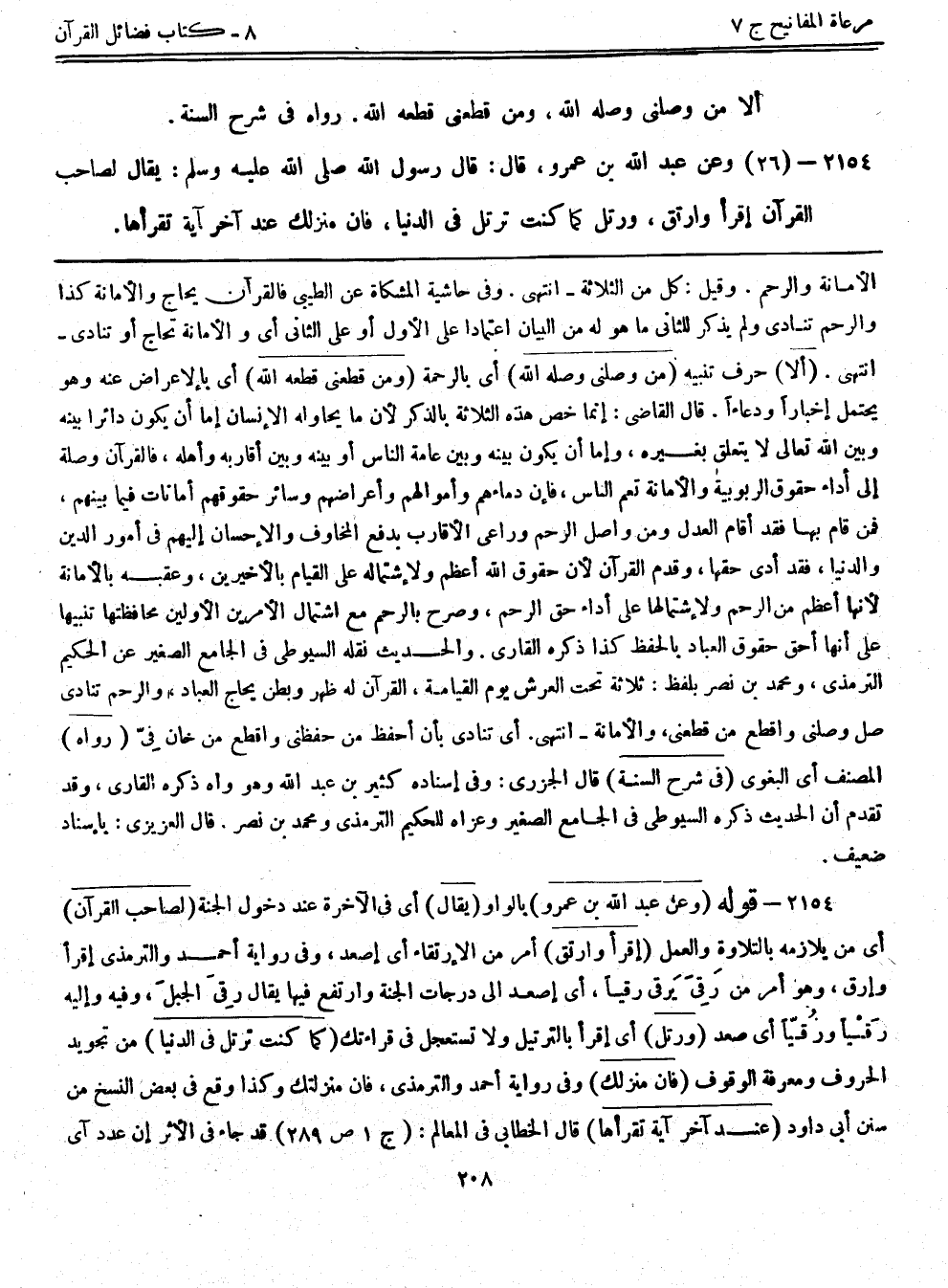 2154 - (26) وعن عبد الله بن عمرو، قال: قال رسول الله صلى الله عليه وسلم: ((يقال لصاحب القرآن إقرأ وارتق، ورتل كما كنت ترتل في الدنيا، فإن منزلك عند آخر آية تقرأها))