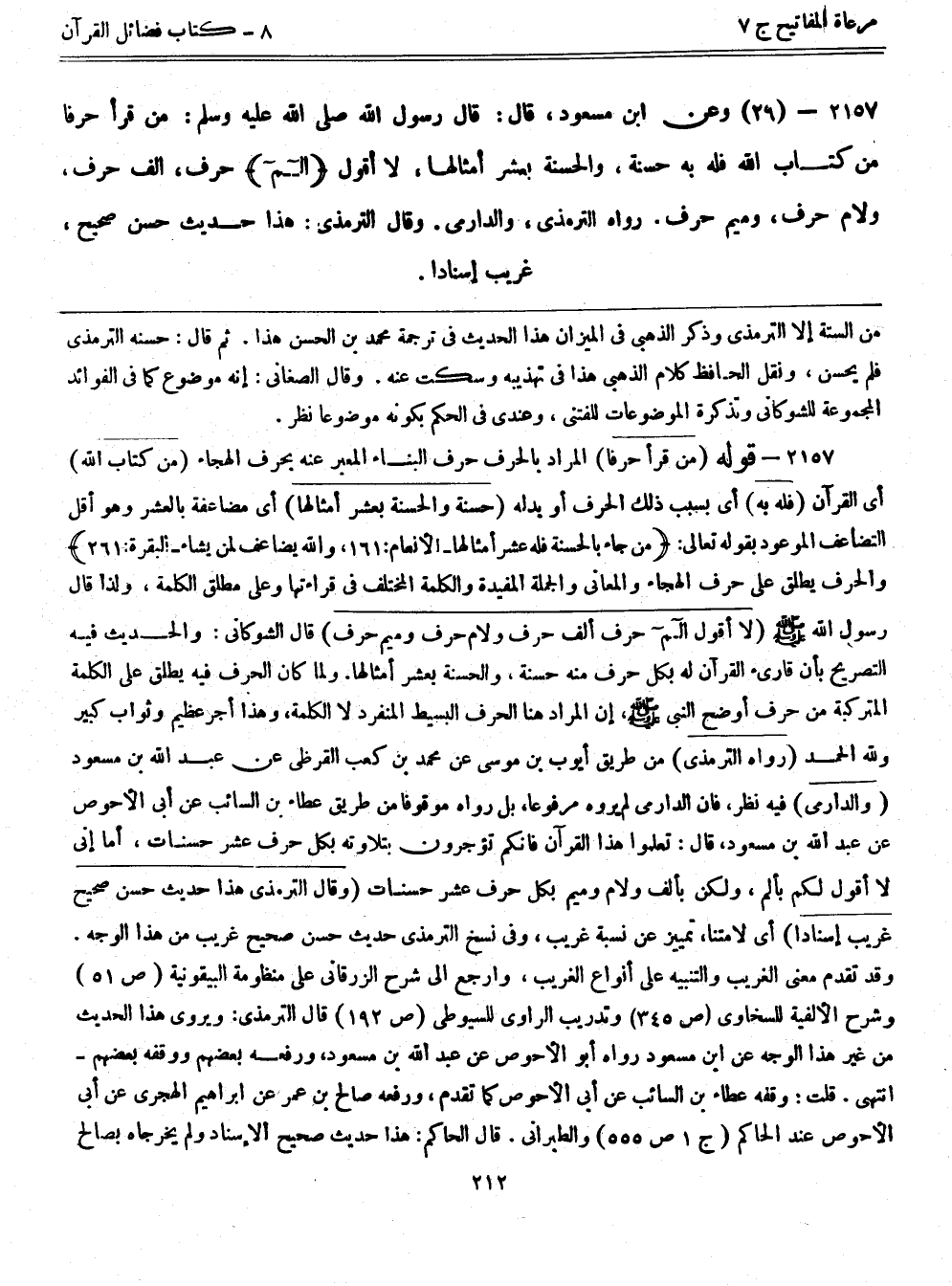 2157- قوله: (من قرأ حرفاً) المراد بالحرف حرف البناء المعبر عنه بحرف الهجاء (من كتاب الله) أي القرآن (فله به) أي بسبب ذلك الحرف أو بدله (حسنة والحسنة بعشر أمثالها) أي مضاعفة بالعشر وهو أقل التضاعف الموعود بقوله تعالى: {من جاء بالحسنة فله عشر أمثالها} [الأنعام: 161] {والله يضاعف لمن يشاء} [البقرة: 261] والحرف يطلق على حرف الهجاء والمعاني والجملة المفيدة والكلمة المختلف في قراءتها وعلى مطلق الكلمة، ولذا قال رسول الله - صلى الله عليه وسلم - (لا أقول الم حرف ألف حرف ولام حرف وميم حرف) قال الشوكاني: والحديث فيه التصريح بأن قاري القرآن له بكل حرف منه حسنة، والحسنة بعشر أمثالها. ولما كان الحرف فيه يطلق على الكلمة المتركبة من حرف أوضح النبي - صلى الله عليه وسلم -، إن المراد هنا الحرف البسيط المنفرد لا الكلمة، وهذا أجر عظيم وثواب كبير ولله الحمد (رواه الترمذي) من طريق أيوب بن موسى عن محمد بن كعب القرظي عن عبد الله بن مسعود (والدارمي) فيه نظر، فإن الدارمي لم يروه مرفوعاً، بل رواه موقوفاً من طريق عطاء بن السائب عن أبي الأحوص عن عبد الله بن مسعود، قال: تعلموا هذا القرآن فإنكم تؤجرون بتلاوته بكل حرف عشر حسنات، أما إني لا أقول لكم بألم، ولكن بألف ولام وميم بكل حرف عشر حسنات (وقال الترمذي هذا حديث حسن صحيح غريب إسناداً) أي لا متنا، تمييز عن نسبة غريب، وفي نسخ الترمذي حديث حسن صحيح غريب من هذا الوجه. وقد تقدم معنى الغريب والتنبيه على أنواع الغريب، وارجع إلى شرح الزرقاني على منظومة البيقونية (ص51) وشرح الألفية للسخاوي (ص345) وتدريب الراوي للسيوطي (ص192) قال الترمذي: ويروي هذا الحديث من غير هذا الوجه عن ابن مسعود رواه أبوالأحوص عن عبد الله بن مسعود، ورفعه بعضهم ووقفه بعضهم- انتهى. قلت: وقفه عطاء بن السائب عن أبي الأحوص كما تقدم، ورفعه صالح بن عمر عن إبراهيم الهجري عن أبي الأحوص عند الحاكم (ج1ص555) والطبراني. قال الحاكم: هذا حديث صحيح الإسناد ولم يخرجاه بصالح