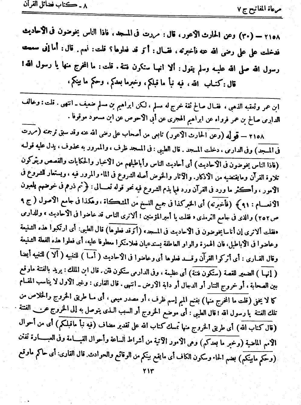 2158- قوله: (وعن الحارث الأعور) تابعي من أصحاب علي رضي الله عنه وقد سبق ترجمته (مررت في المسجد) وفي الدارمي، دخلت المسجد. قال الطيبي: في المسجد ظرف، والممرور به محذوف، يدل عليه قوله (فإذا الناس يخوضون في الأحاديث) أي أحاديث الناس وأباطيلهم من الأخبار والحكايات والقصص ويتركون تلاوة القرآن وما يقتضيه من الأذكار. والآثار والخوض أصله الشروع في الماء والمرور فيه، ويستعار للشروع في الأمور، وأكثر ما ورد في القرآن ورد فيما يذم الشروع فيه نحو قوله تعالى: {ثم ذرهم في خوضهم يلعبون} [الأنعام: 91] (فأخبرته) أي الخبر كذا في جميع النسخ من المشكاة، وهكذا في جامع الأصول (ج9ص252) والذي في جامع الترمذي "فقلت يا أمير المؤمنين! ألا ترى الناس قد خاضوا في الأحاديث" وللدارمي "فقلت ألا ترى إن أناساً يخوضون في الأحاديث في المسجد" (أوَ قد فعلوها) قال الطيبي: أي ارتكبوا هذه الشنيعة وخاضوا في الأباطيل، فإن الهمزة والواو العاطفة يستدعيان فعلاً منكراً معطوفاً عليه، أي فعلوا هذه الفعلة الشنيعة وقال القاري: أي أتركوا القرآن وقد فعلوها أي وخاضوا في الأحاديث (أما) للتنبيه (ألا) للتنبيه أيضاً (إنها) الضمير للقصة (ستكون فتنة) أي عظيمة، وفي الدارمي ستكون فتن. قال ابن الملك: يريد بالفتنة ما وقع بين الصحابة، أو خروج التتار أو الدجال أو دابة الأرض- انتهى. قال القاري: وغير الأول لا يناسب المقام كما لا يخفى (قلت ما المخرج منها) بفتح الميم اسم ظرف، أو مصدر ميمي، أي ما طريق الخروج والخلاص من تلك الفتنة يا رسول الله! قال الطيبي: أي موضع الخروج أو السبب الذي يتوصل به إلى الخروج عن الفتنة (قال كتاب الله) أي طريق الخروج منها تمسك كتاب الله على تقدير مضاف (فيه نبأ ما قبلكم) أي من أحوال الأمم الماضية (وخبر ما بعدكم) وهي الأمور الآتية من أشراط الساعة وأحوال القيامة وفي العبارة تفنن (وحكم ما بينكم) بضم الحاء وسكون الكاف أي ما يقع بينكم من الوقائع والحوادث. قال القاري: أي حاكم ما وقع