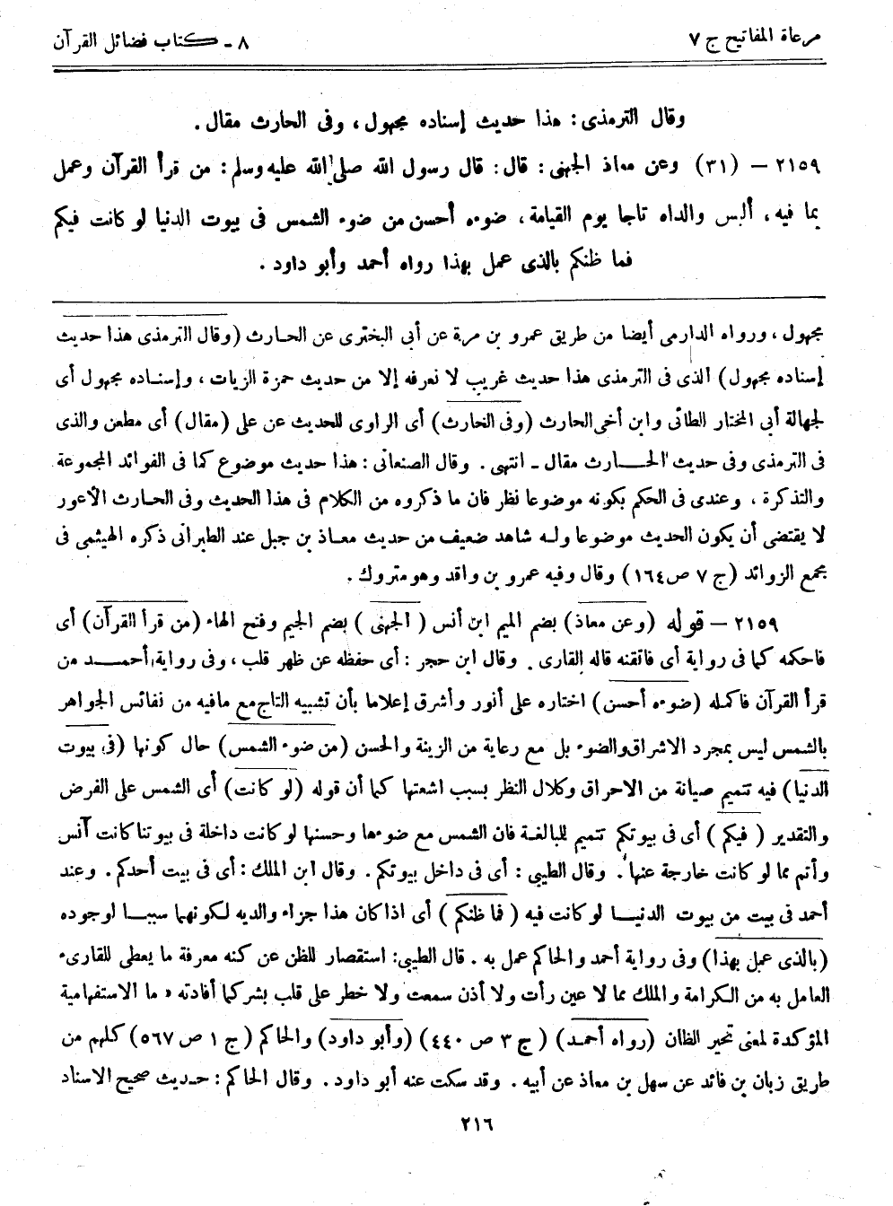 2159- قوله: (وعن معاذ) بضم الميم ابن أنس (الجهني) بضم الجيم وفتح الهاء (من قرأ القرآن) أي فأحكمه كما في رواية أي فاتقنه قاله القاري. وقال ابن حجر: أي حفظه عن ظهر قلب، وفي رواية أحمد من قرأ القرآن فأكمله (ضوءه أحسن) اختاره على أنور وأشرق إعلاماً بأن تشبيه التاج مع ما فيه من نفائس الجواهر بالشمس ليس بمجرد الإشراق والضوء بل مع رعاية من الزينة والحسن (من ضوء الشمس) حال كونها (في بيوت الدنيا) فيه تتميم صيانة من الإحراق وكلال النظر بسبب أشعتها كما أن قوله (لو كانت) أي الشمس على الفرض والتقدير (فيكم) أي في بيوتكم تتميم للمبالغة فإن الشمس مع ضوئها وحسنها لو كانت داخلة في بيوتنا كانت آنس وأتم مما لو كانت خارجة عنها. وقال الطيبي: أي في داخل بيوتكم. وقال ابن الملك: أي في بيت أحدكم. وعند أحمد في بيت من بيوت الدنيا لو كانت فيه (فما ظنكم) أي إذا كان هذا جزاء والديه لكونهما سبباً لوجوده (بالذي عمل بهذا) وفي رواية أحمد والحاكم عمل به. قال الطيبي: استقصار للظن عن كنه معرفة ما يعطي للقاري العامل به من الكرامة والملك مما لا عين رأت ولا أذن سمعت ولا خطر على قلب بشر كما أفادته "ما الاستفهامية المؤكدة لمعنى تحير الظان" (رواه أحمد) (ج3ص440) (وأبوداود) والحاكم (ج1ص567) كلهم من طريق زبان بن فائد عن سهل بن معاذ عن أبيه. وقد سكت عنه أبوداود. وقال الحاكم: حديث صحيح الإسناد