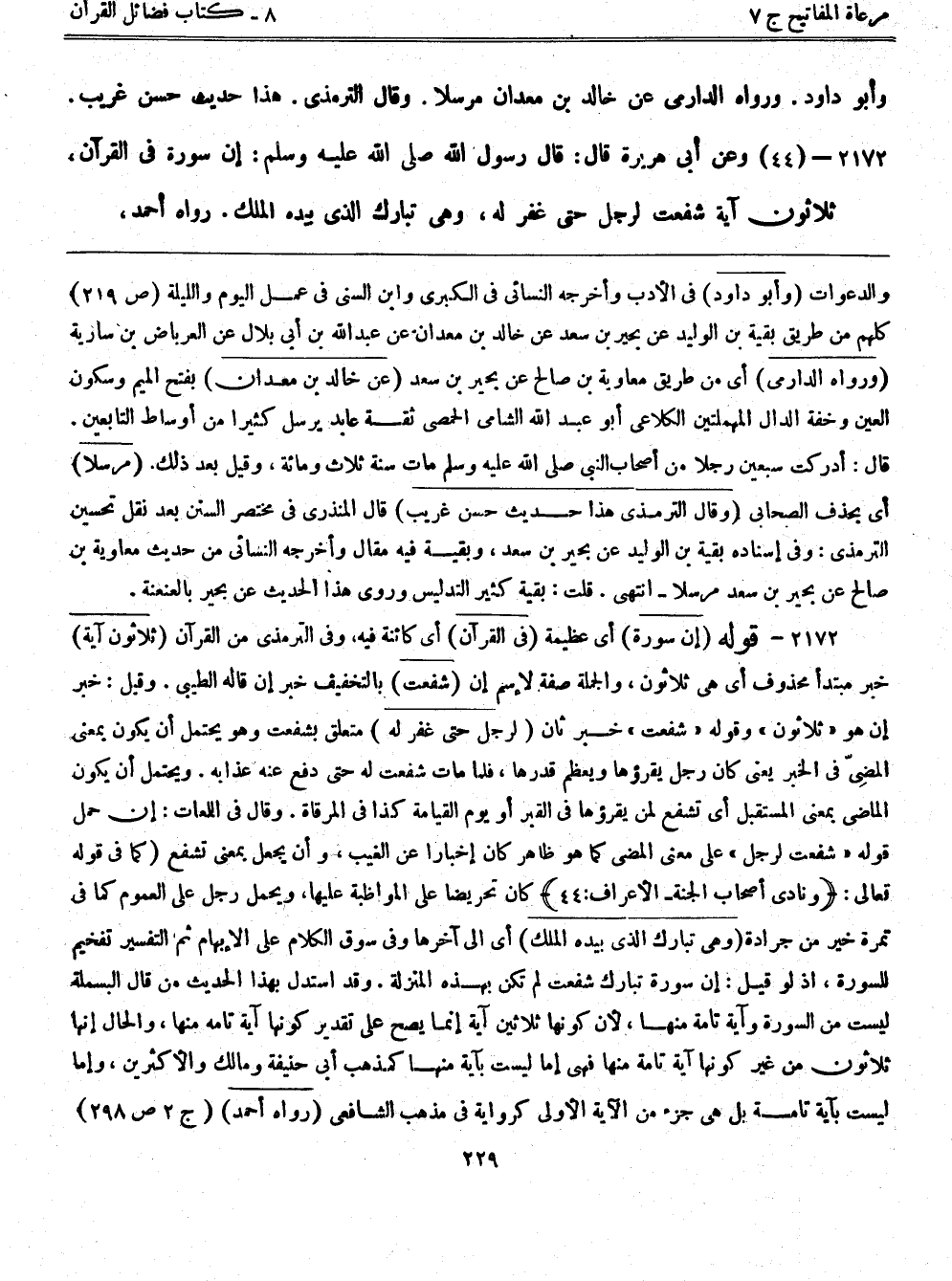 2172- (44) وعن أبي هريرة قال: قال رسول الله صلى الله عليه وسلم: ((إن سورة في القرآن، ثلاثون آية شفعت لرجل حتى غفر له، وهي تبارك الذي بيده الملك)) رواه أحمد،