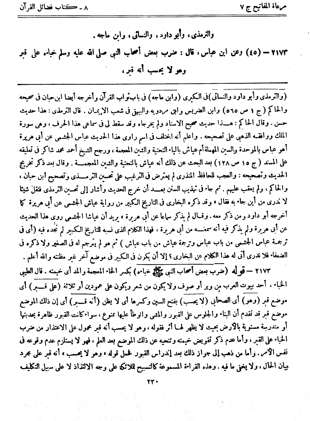 2173 - (45) وعن ابن عباس، قال: ضرب بعض أصحاب النبي صلى الله عليه وسلم خباءه على قبر وهو لا يحسب أنه قبر،