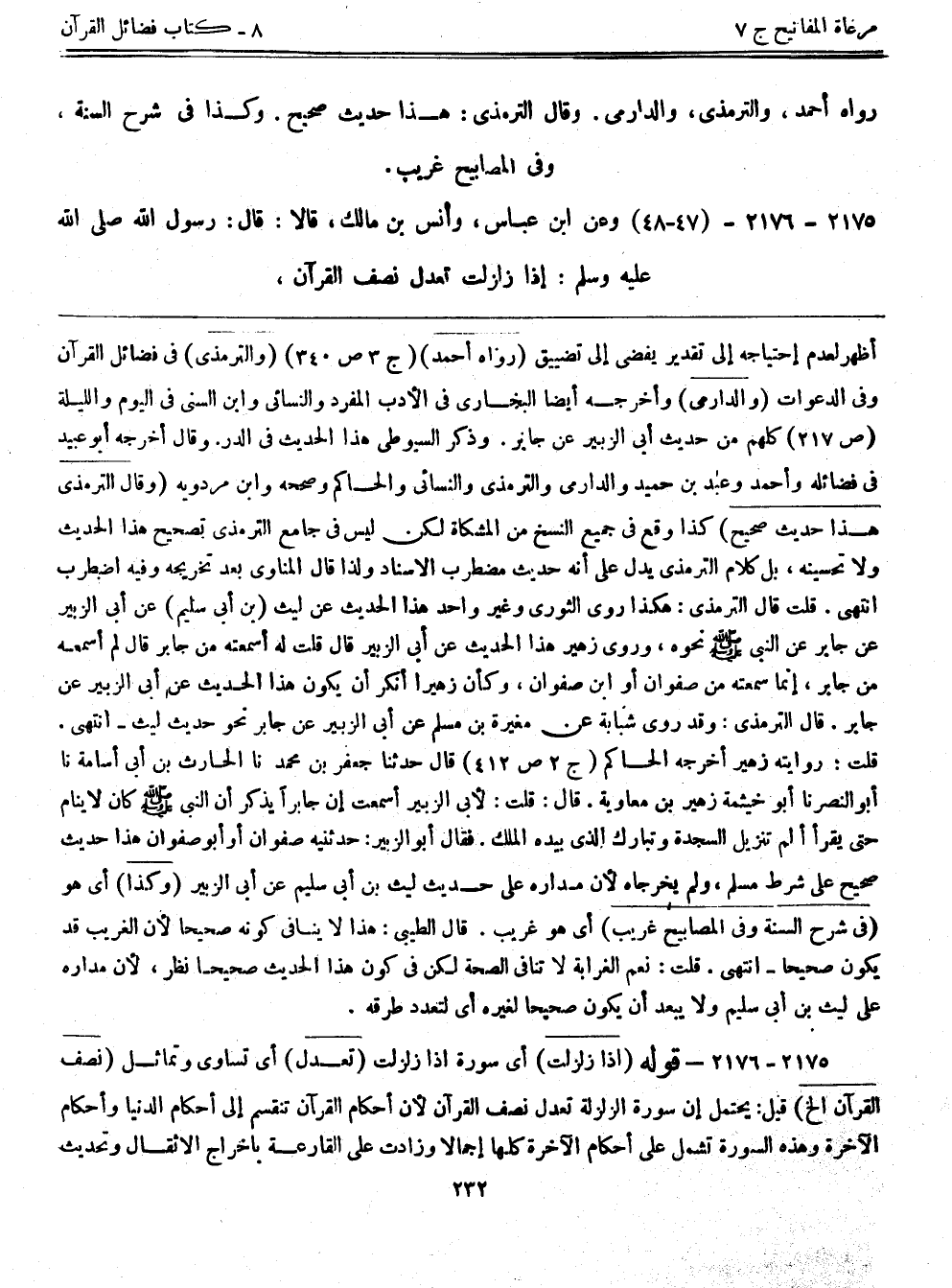 2175- 2176- (47- 48) وعن ابن عباس، وأنس بن مالك، قالا: قال رسول الله صلى الله عليه وسلم: ((إذا زلزلت تعدل نصف القرآن،