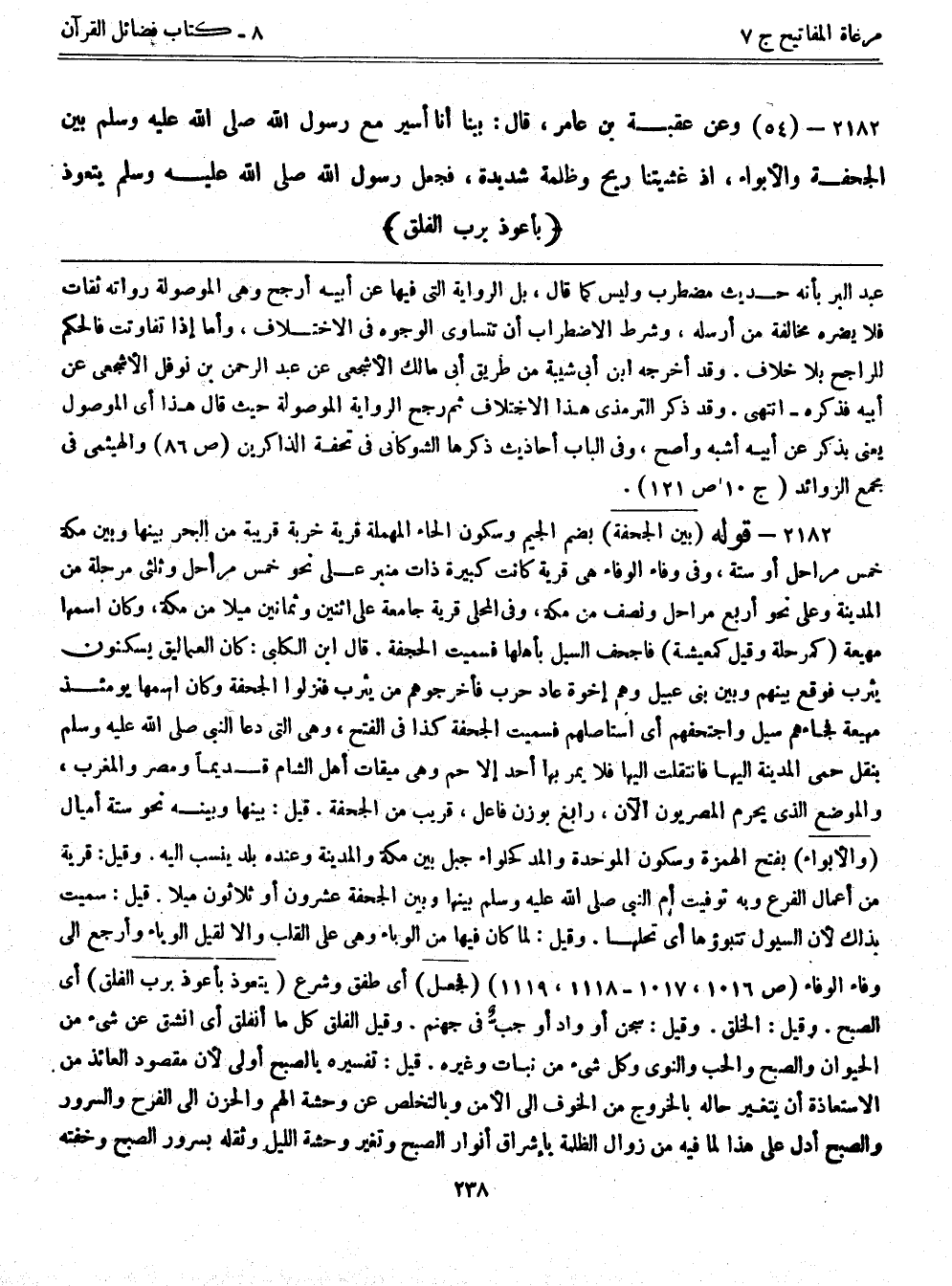 2182- قوله: (بين الجحفة) بضم الجيم وسكون الحاء المهملة قرية خربة قريبة من البحر بينها وبين مكة خمس مراحل أو ستة، وفي وفاء الوفاء هي قرية كانت كبيرة ذات منبر على نحو خمس مراحل وثلثي مرحلة من المدينة وعلى نحو أربع مراحل ونصف من مكة، وفي المحلى قرية جامعة على اثنين وثمانين ميلاً من مكة، وكان اسمها مهيعة (كمرحلة وقيل كمعيشة) فاجحف السيل بأهلها فسميت الجحفة. قال ابن الكلبي: كان العماليق يسكنون يثرب فوقع بينهم وبين بني عبيل وهم إخوة عاد حرب فأخرجوهم من يثرب فنزلوا الجحفة وكان اسمها يومئذ مهيعة فجاءهم سيل واجتحفهم أي استأصلهم فسميت الجحفة كذا في الفتح، وهي التي دعا النبي صلى الله عليه وسلم بنقل حمى المدينة إليها فانتقلت إليها فلا يمر بها أحد إلا حم وهي ميقات أهل الشام قديماً ومصر والمغرب، والموضع الذي يحرم المصريون الآن، رابغ بوزن فاعل، قريب من الجحفة. قيل: بينها وبينه نحو ستة أميال (والأبواء) بفتح الهمزة وسكون الموحدة والمد كحلواء جبل بين مكة والمدينة وعنده بلد ينسب إليه. وقيل: قرية من أعمال الفرع وبه توفيت أم النبي صلى الله عليه وسلم بينها وبين الجحفة عشرون أو ثلاثون ميلاً. قيل: سميت بذلك لأن السيول تتبوؤها أي تحلها. وقيل: لما كان فيها من الوباء وهي على القلب وإلا لقيل الوباء وأرجع إلى وفاء الوفاء (ص1016، 1017- 1118، 1119) (فجعل) أي طفق وشرع (يتعوذ بأعوذ برب الفلق) أي الصبح. وقيل: الخلق. وقيل: سجن أو واد أو جبٌّ في جهنم. وقيل الفلق كل ما أنفلق أي انشق عن شي من الحيوان والصبح والحب والنوى وكل شي من نبات وغيره. قيل: تفسيره بالصبح أولى لأن مقصود العائذ من الاستعاذة أن يتغير حاله بالخروج من الخوف إلى الأمن وبالتخلص عن وحشة الهم والحزن إلى الفرح والسرور والصبح أدل على هذا لما فيه من زوال الظلمة بإشراق أنوار الصبح وتغير وحشة الليل وثقله بسرور الصبح وخفته