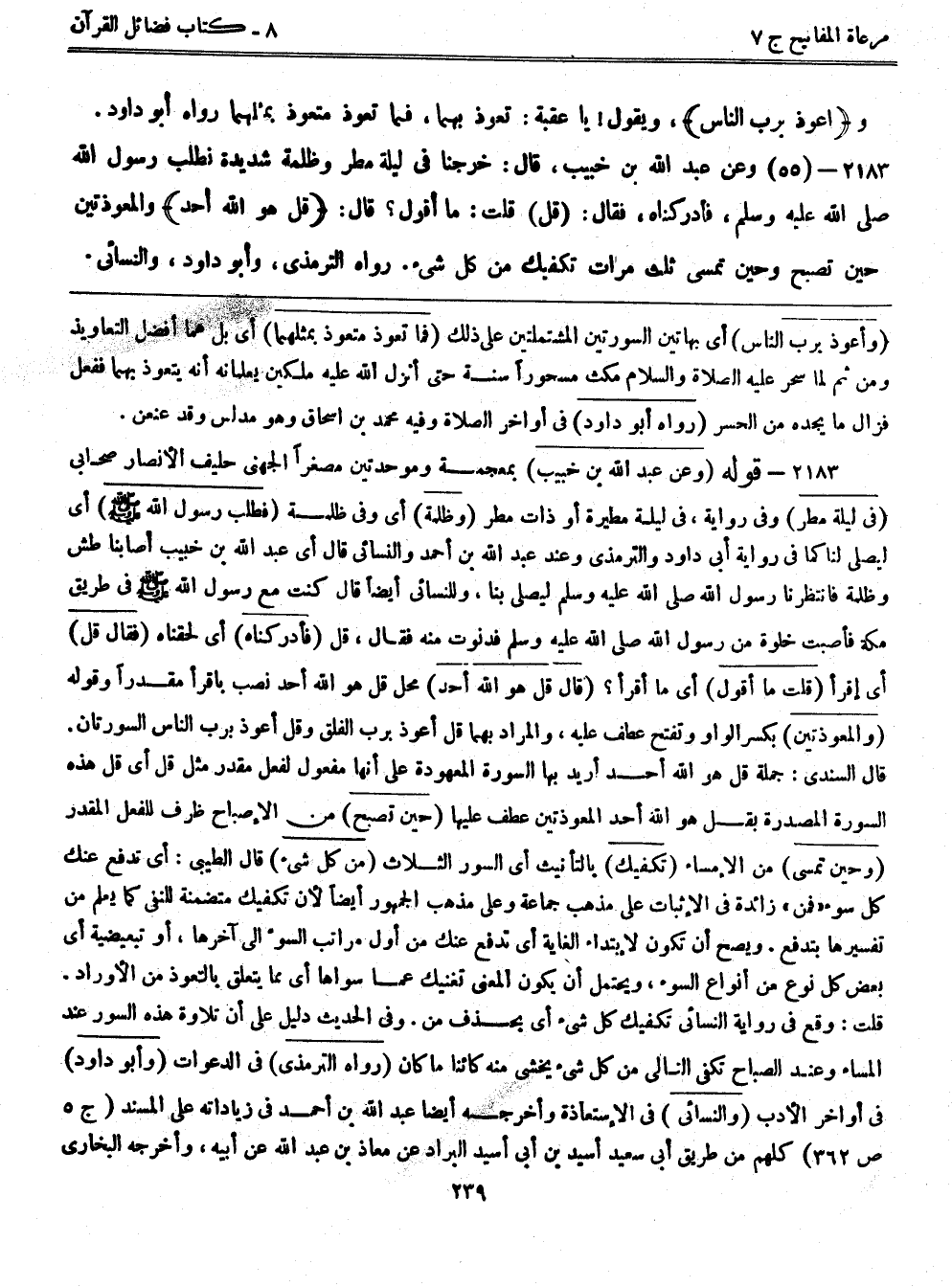 2183- (55) وعن عبد الله بن خبيب، قال: خرجنا في ليلة مطر وظلمة شديدة نطلب رسول الله صلى الله عليه وسلم، فأدركناه، فقال: (قل) قلت: ما أقول؟ قال: {قل هو الله أحد} والمعوذتين حين تصبح وحين تمسي ثلث مرات تكفيك من كل شي)) . رواه الترمذي، وأبوداود، والنسائي.
